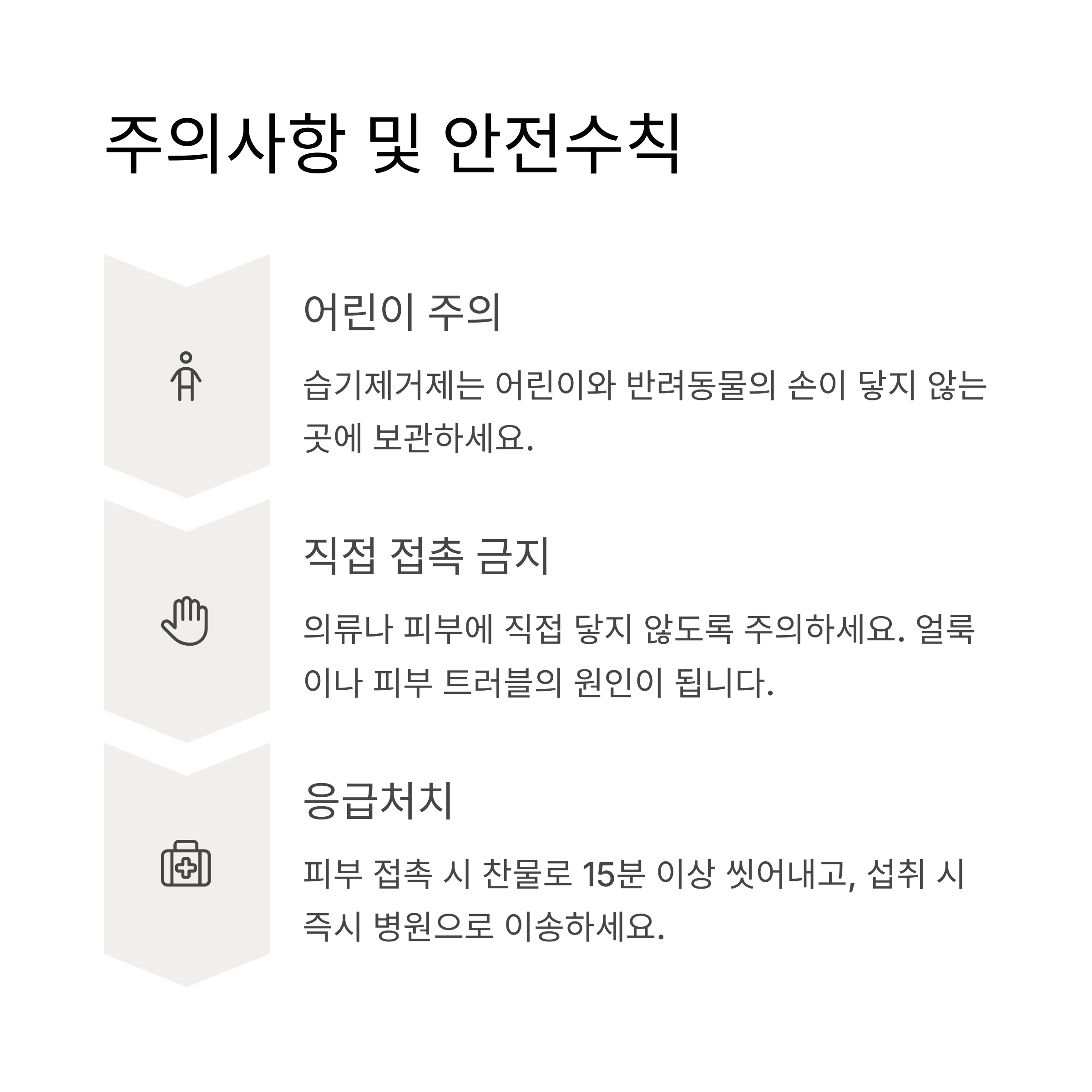 습기제거제는 어린이와 반려동물의 손이 닿지 않는 곳에 보관하세요. 특히 염화칼슘 성분은 섭취 시 위험할 수 있습니다.