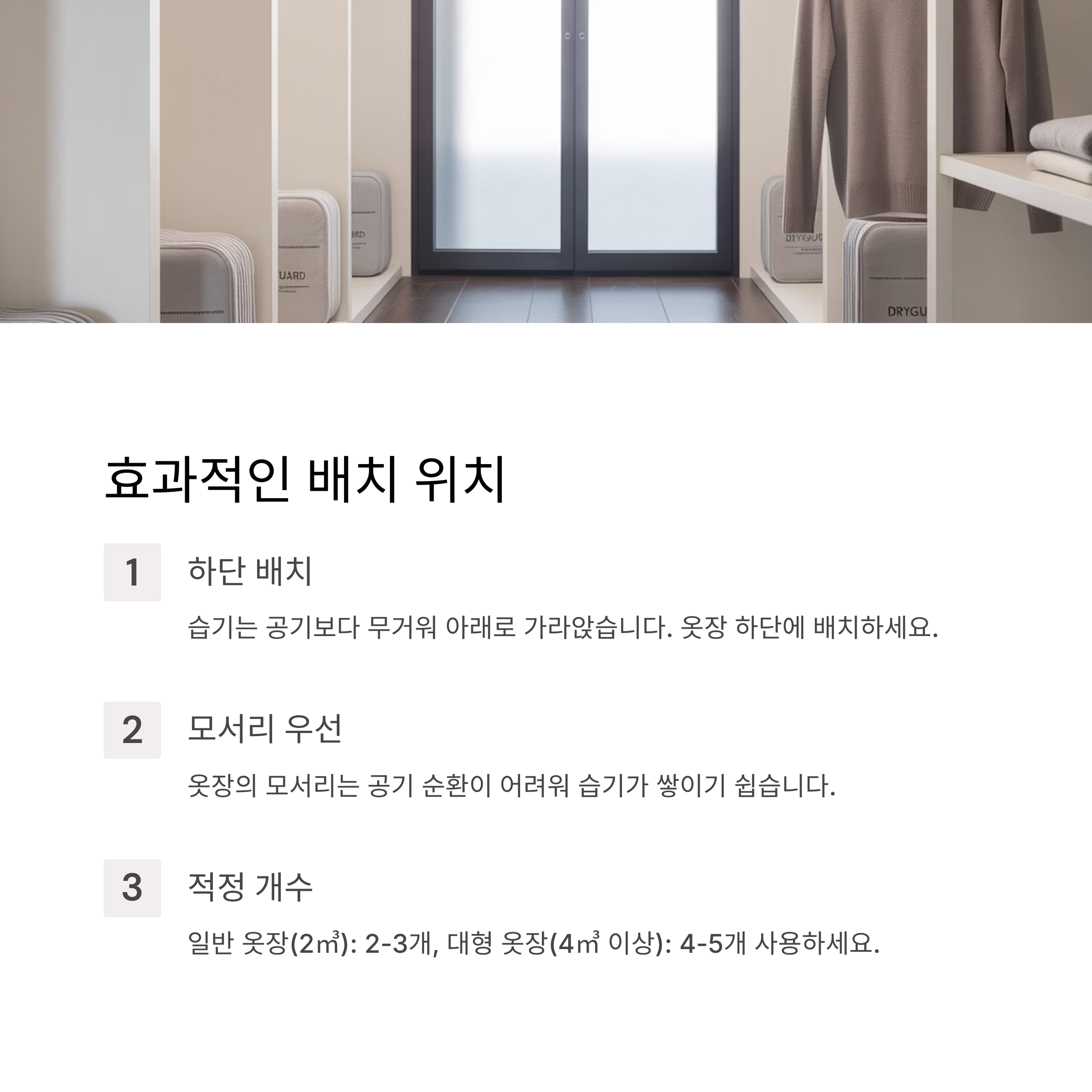 습기는 공기보다 무겁기 때문에 아래쪽으로 가라앉는 특성이 있습니다. 따라서 습기제거제는 옷장의 하단에 배치하는 것이 가장 효과적입니다.