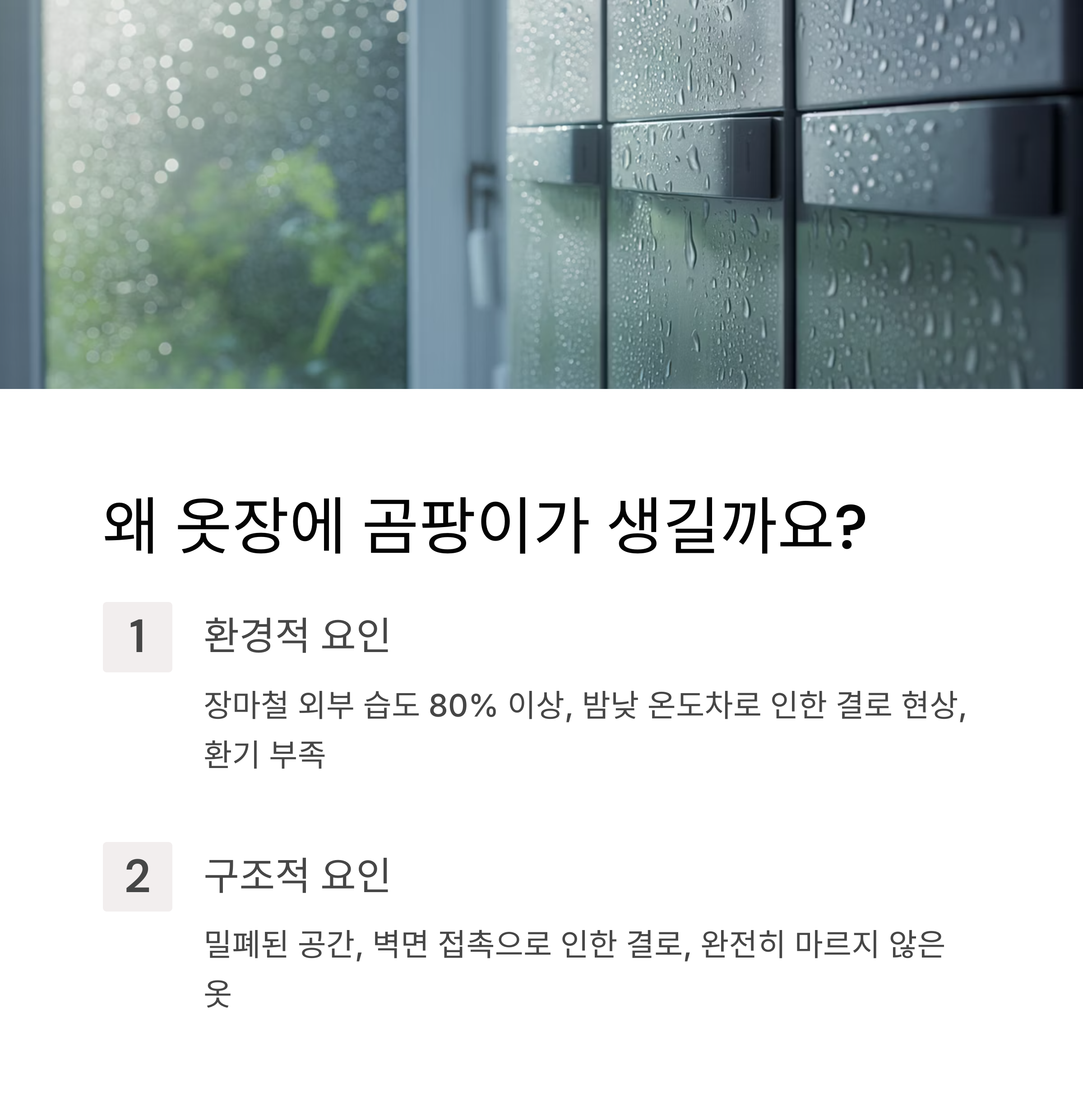 ✓ 높은 외부 습도: 장마철에는 외부 습도가 80% 이상으로 올라가며, 이는 실내로 침투하여 옷장 내부까지 영향을 미칩니다.