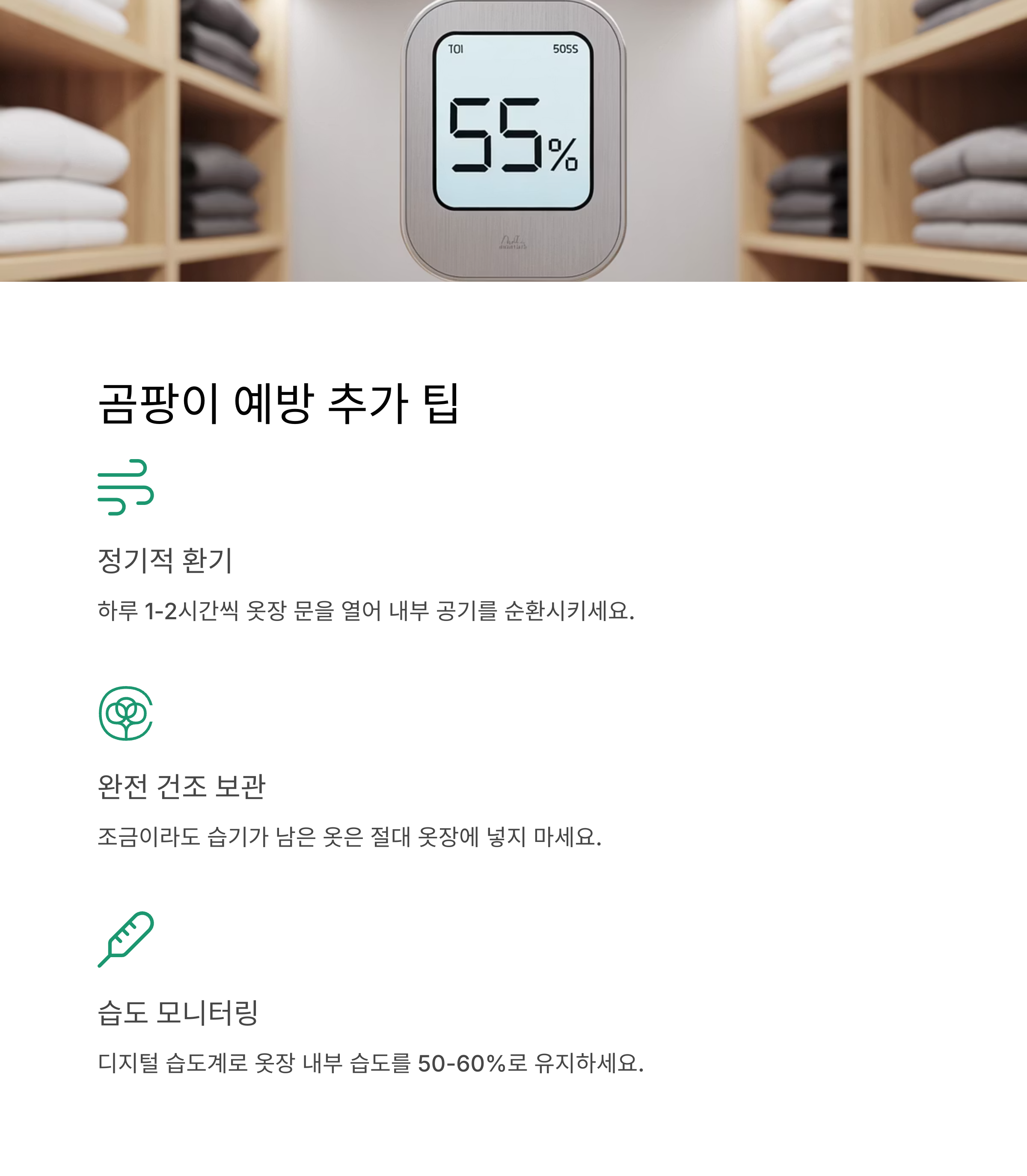 하루 1-2시간씩 옷장 문을 열어두어 내부 공기를 순환시키세요. 특히 비가 오지 않는 날에는 반드시 실시하세요.