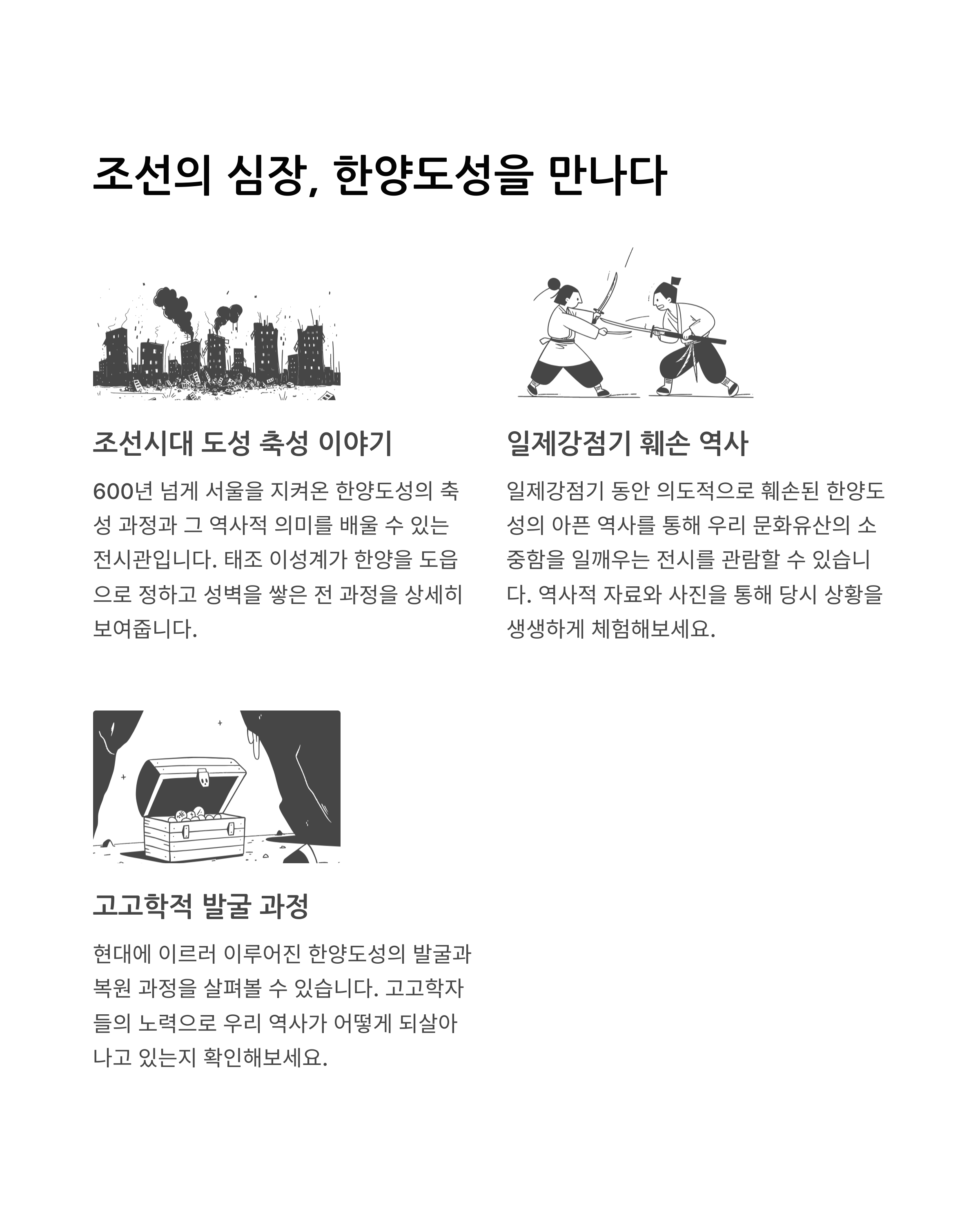 | 한양도성 유적전시관 | 조선의 도성과 근현대사까지 함께 볼 수 있는 공간 |
