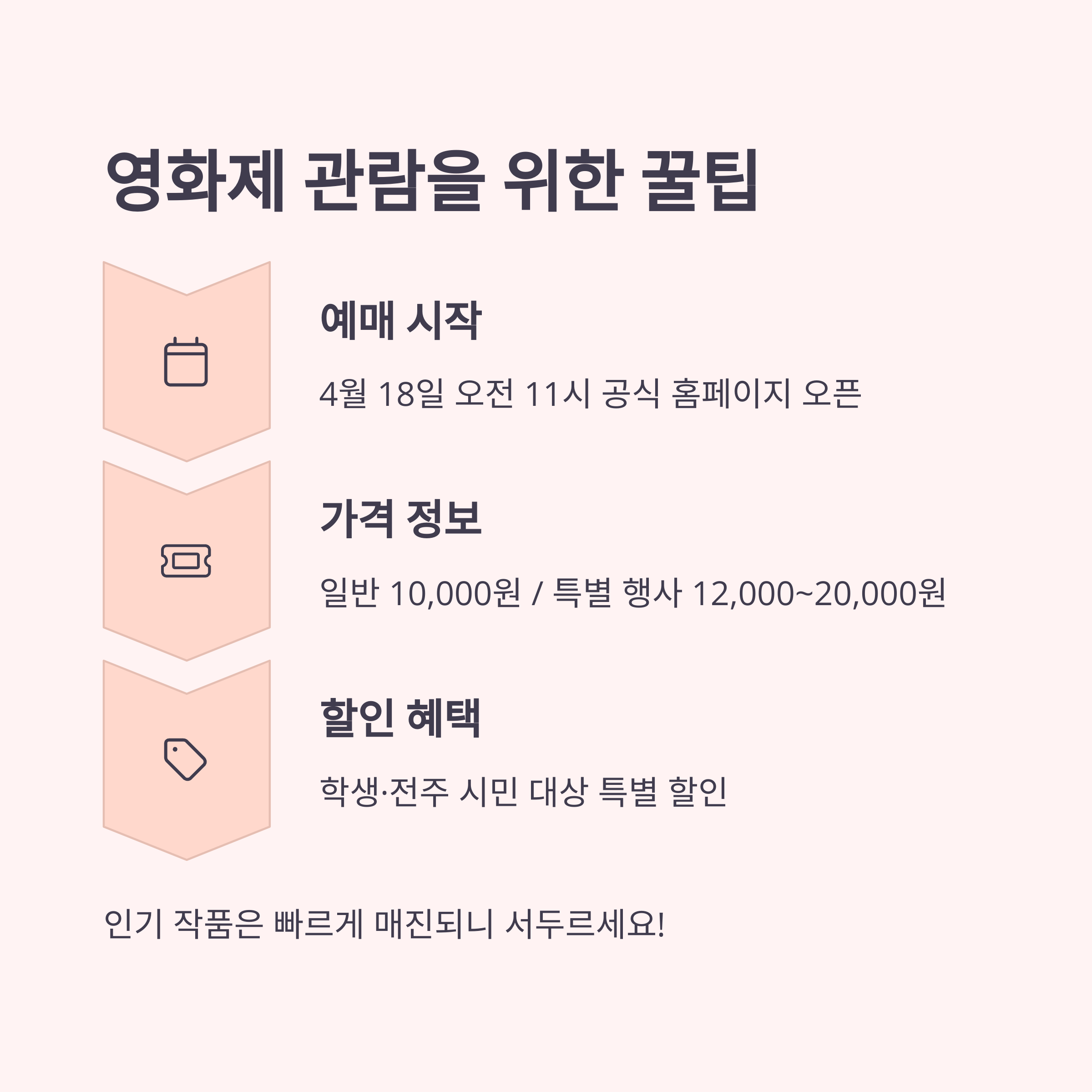 전주국제영화제는 인기 작품의 경우 예매 시작 후 빠르게 매진되는 경우가 많습니다. 원하는 영화를 놓치지 않기 위한 예매 꿀팁을 소개합니다!