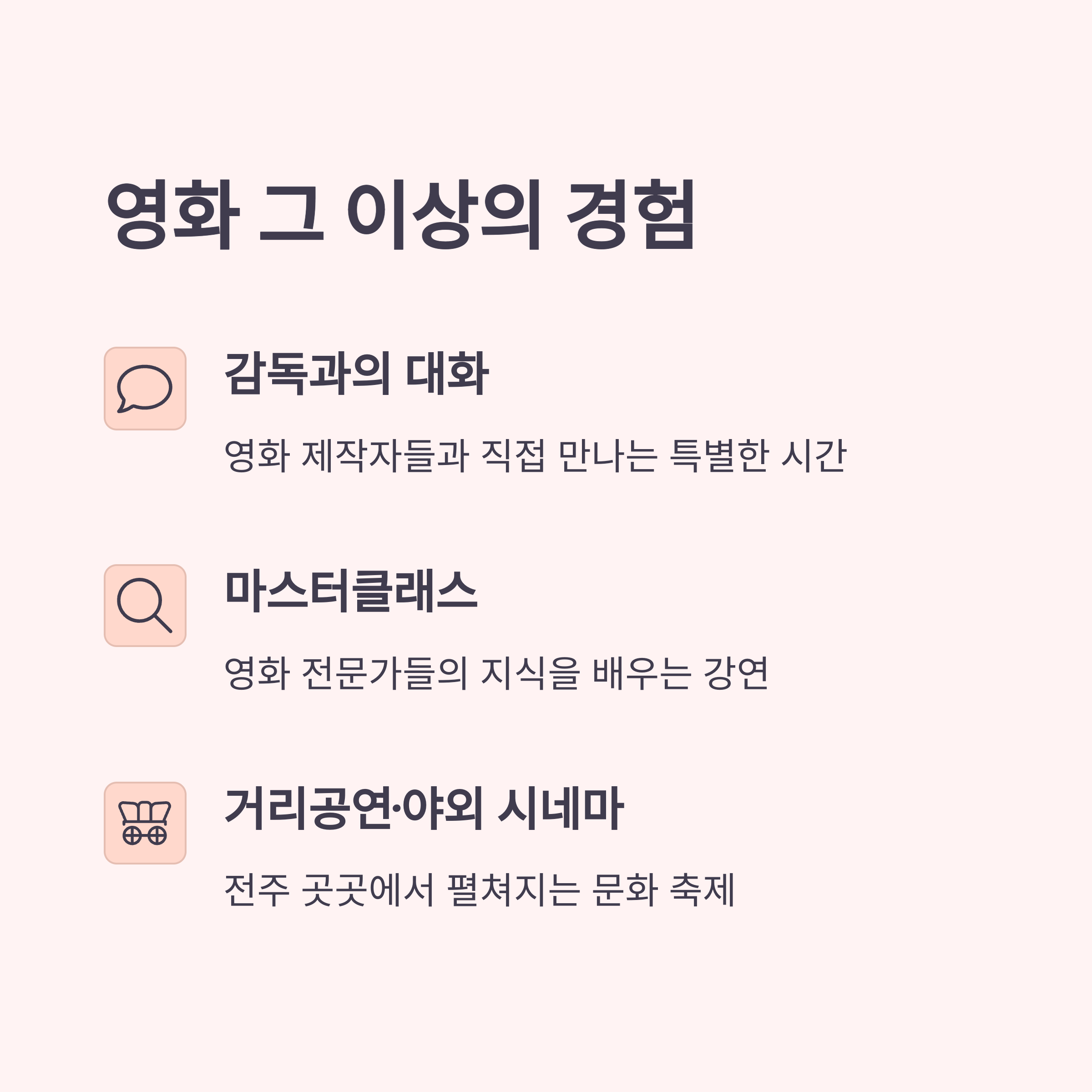 - 2일차: 시네필 전주 섹션 작품 관람 → 게스트와의 대화 참여