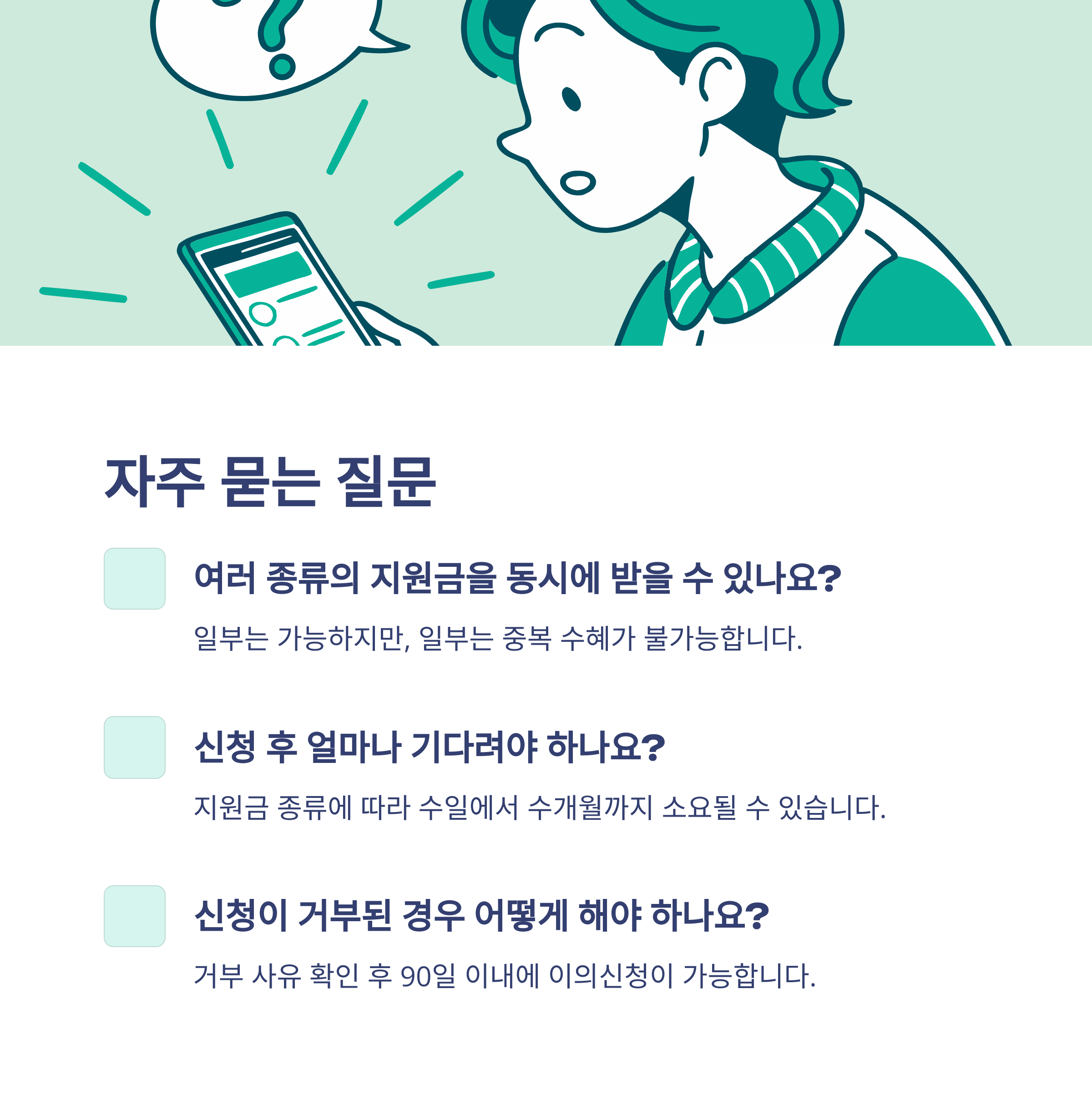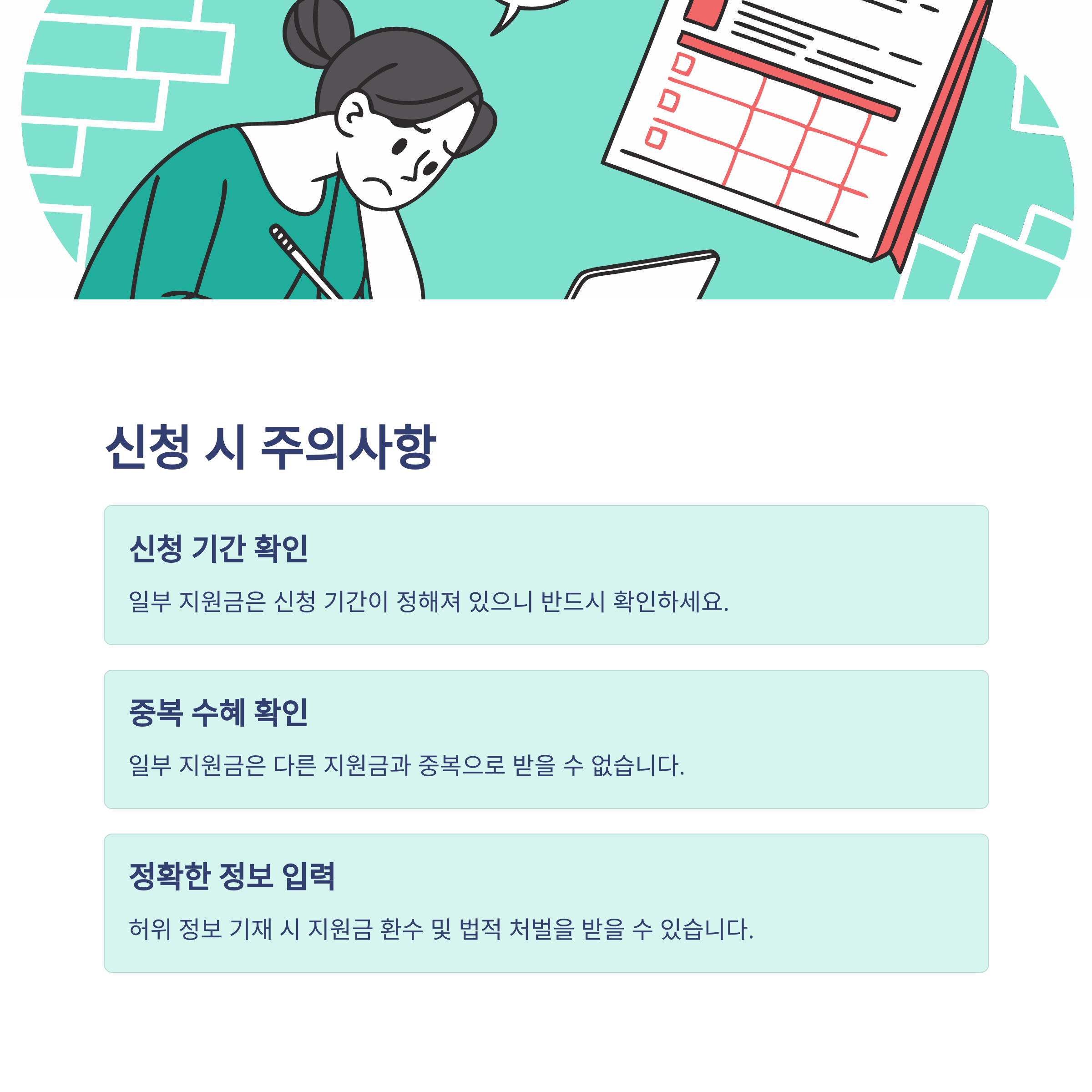 - 복잡한 지원금의 경우, 주민센터 담당자나 콜센터 상담을 통해 정확한 정보를 얻은 후 신청하세요.