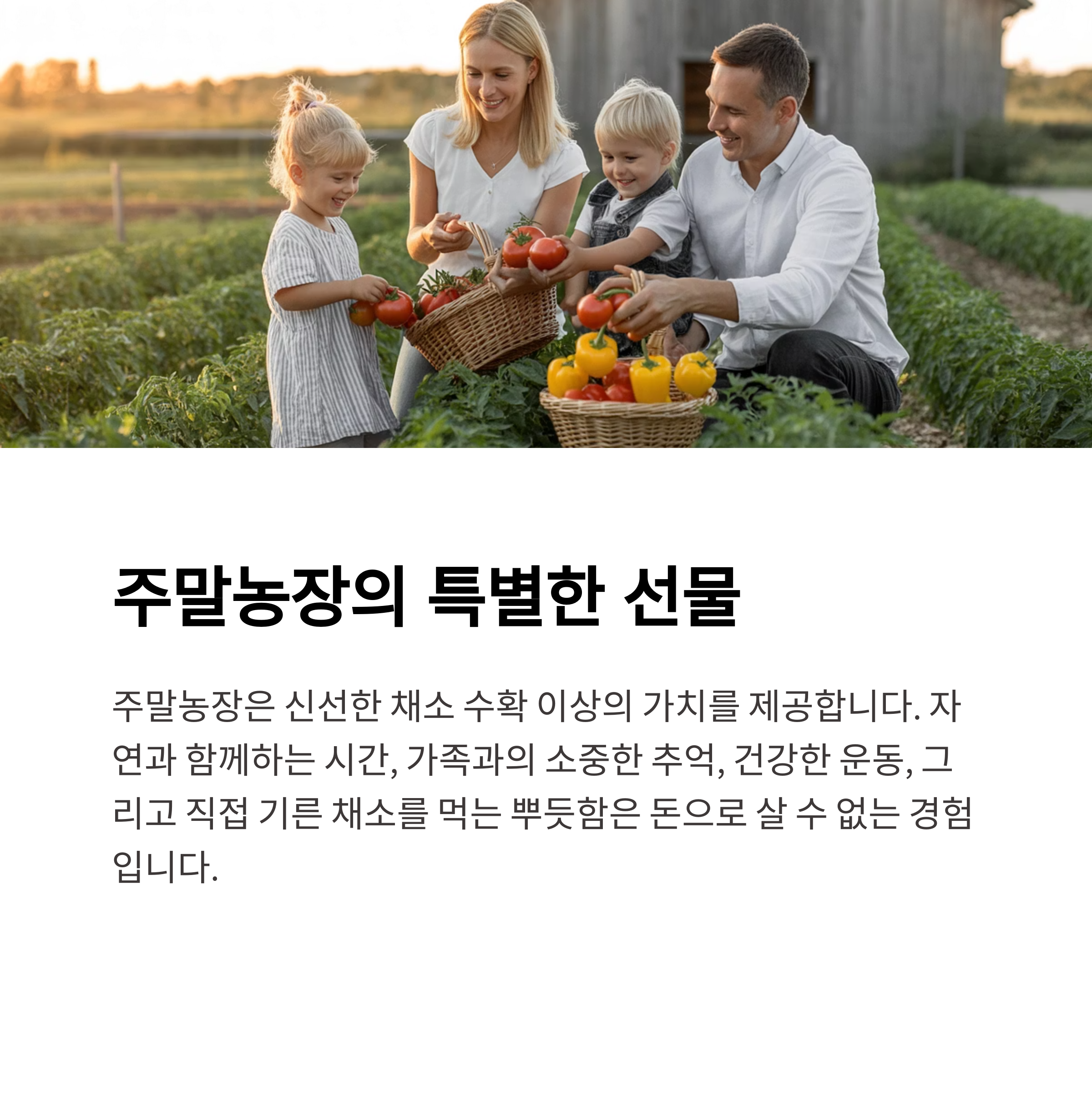 주말농장은 신선한 채소 수확 이상의 가치를 제공합니다. 자연과 함께하는 시간, 가족과의 소중한 추억, 건강한 운동, 그리고 무엇보다 직접 기른 채소를 먹는 뿌듯함과 성취감은 돈으로 살 수 없는 소중한 경험입니다.