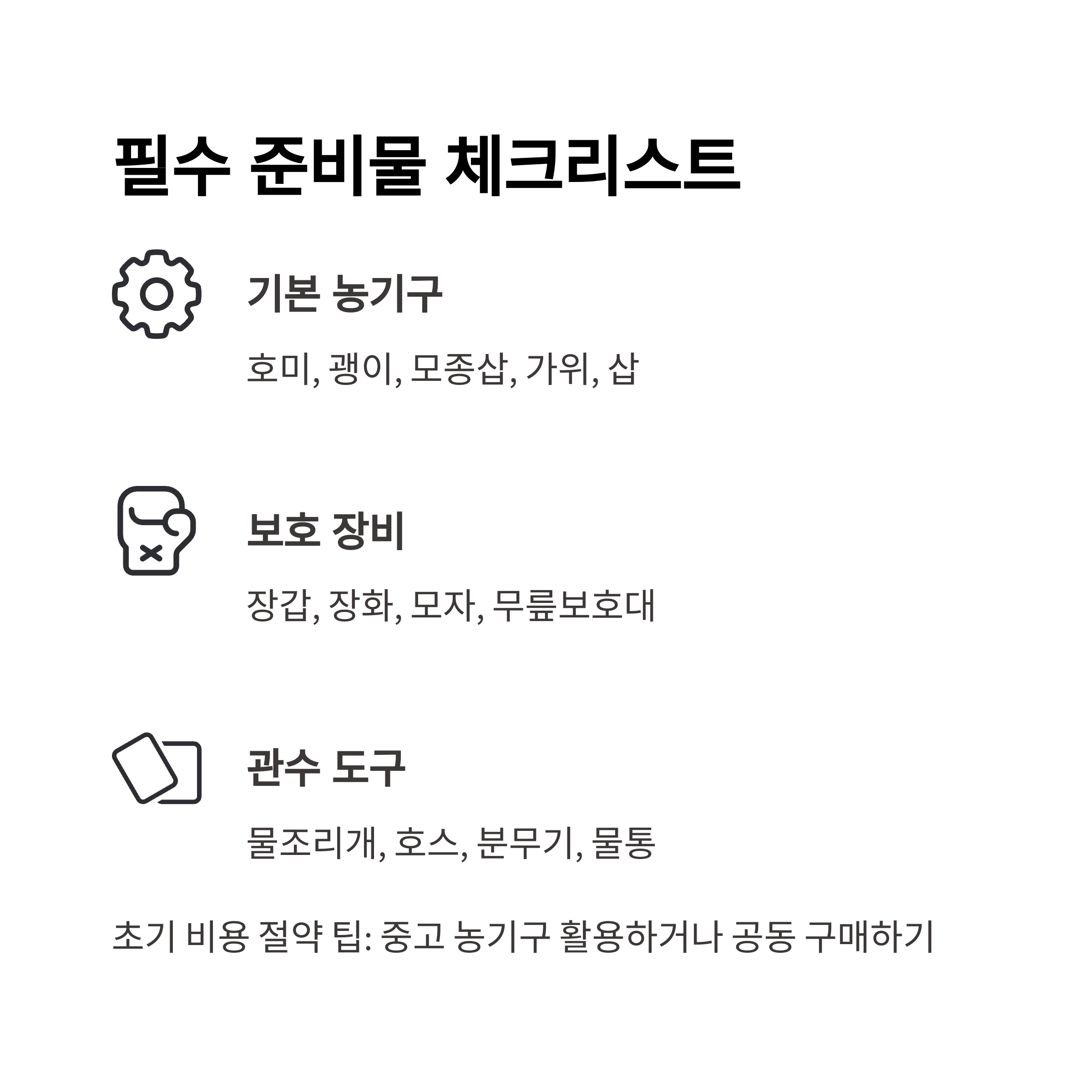 처음부터 모든 도구를 새로 살 필요는 없습니다. 중고 농기구를 활용하거나, 다른 농장 이용자들과 공동으로 구매하면 비용을 절약할 수 있습니다. 또한 기본 도구부터 시작해서 필요에 따라 하나씩 추가하는 것이 경제적입니다.