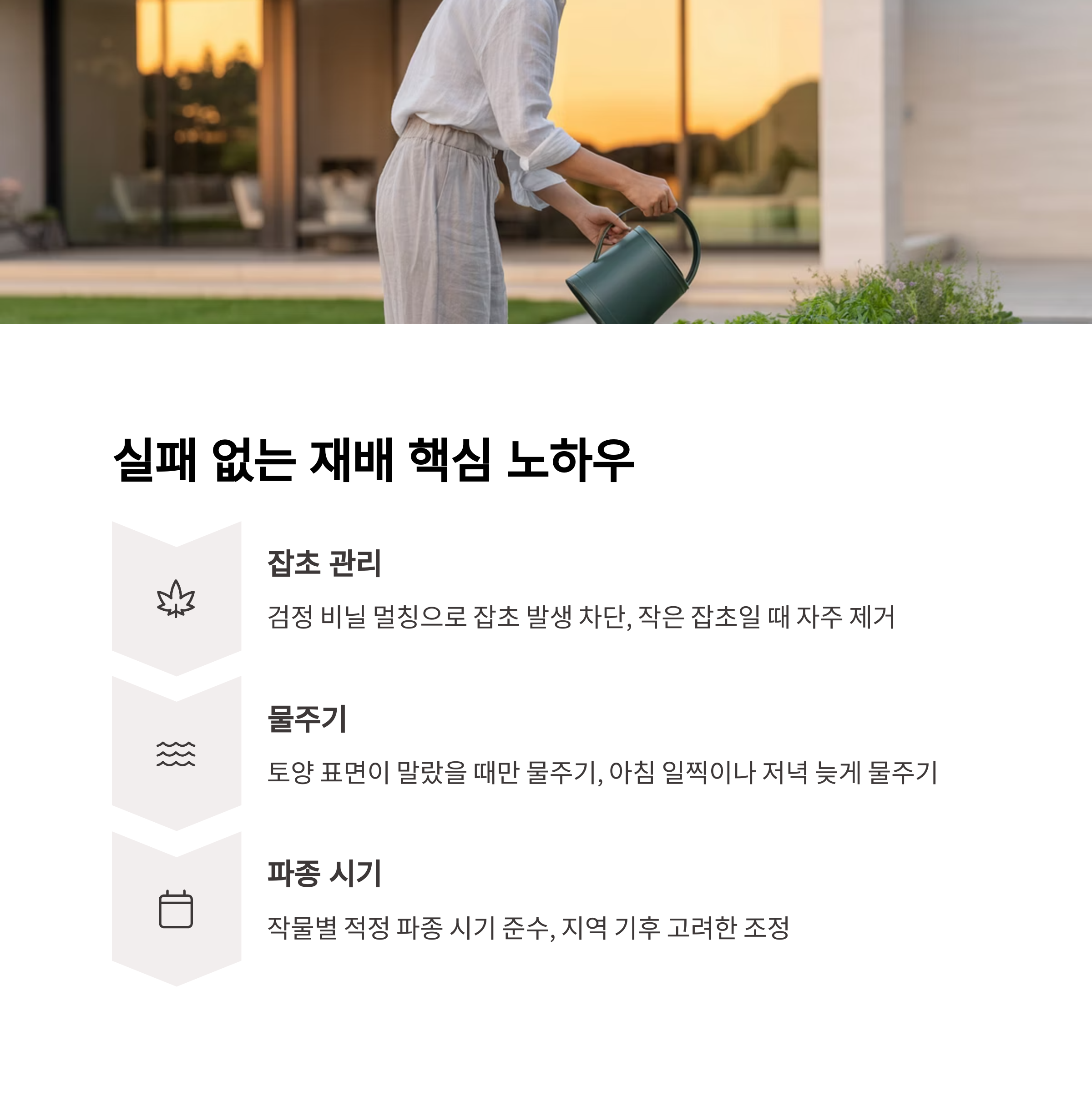 • 단계적 확장: 경험이 쌓이면 재배 면적 늘리기
