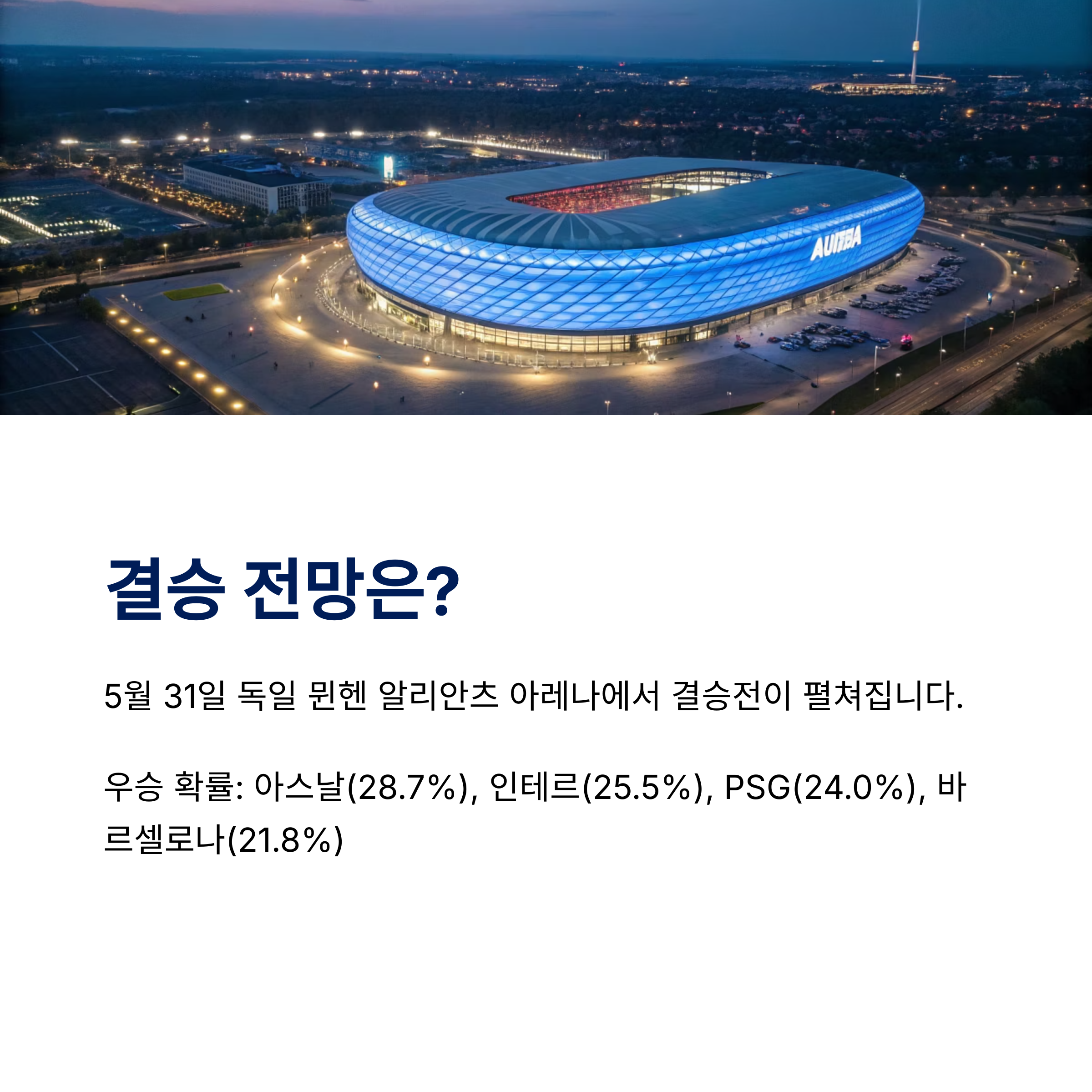 알리안츠 아레나는 독일 분데스리가의 명문 클럽 바이에른 뮌헨의 홈구장으로, UEFA 5성급 경기장입니다. 이전에도 2012년 UEFA 챔피언스리그 결승전(첼시 vs 바이에른 뮌헨)을 개최한 바 있으며, 2006년 FIFA 월드컵과 2021년 UEFA 유로 등 주요 국제 대회의 경기장으로도 사용되었습니다.