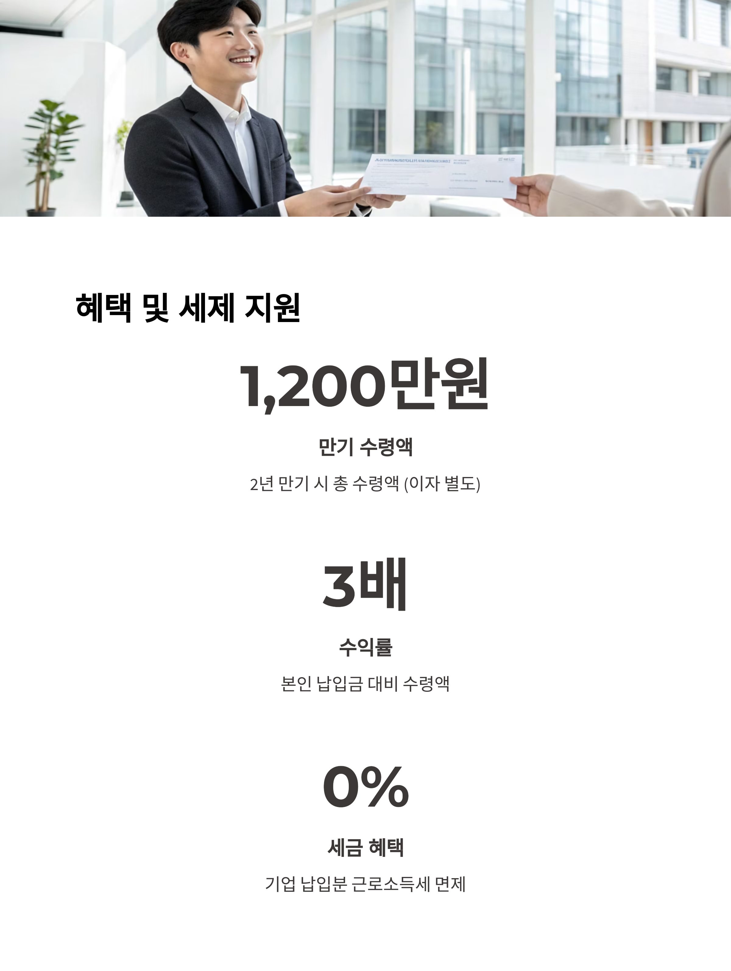 • 청년내일채움공제: 2년 만기, 총 1,200만원 + 이자