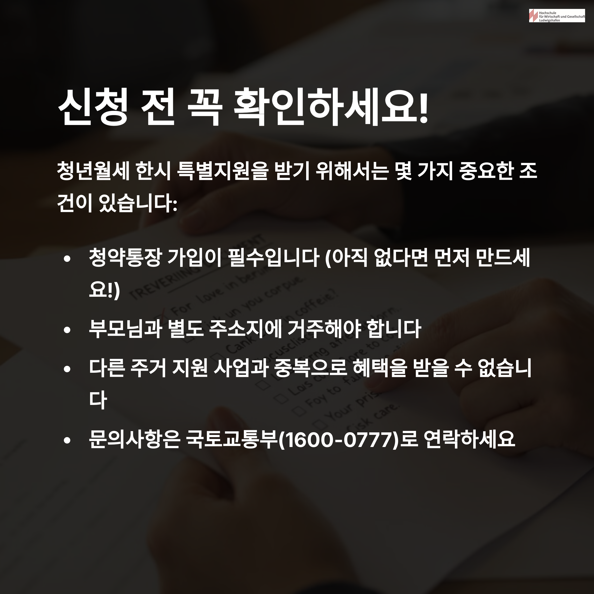 • 주거 요건: 부모와 별도로 거주하는 무주택 청년