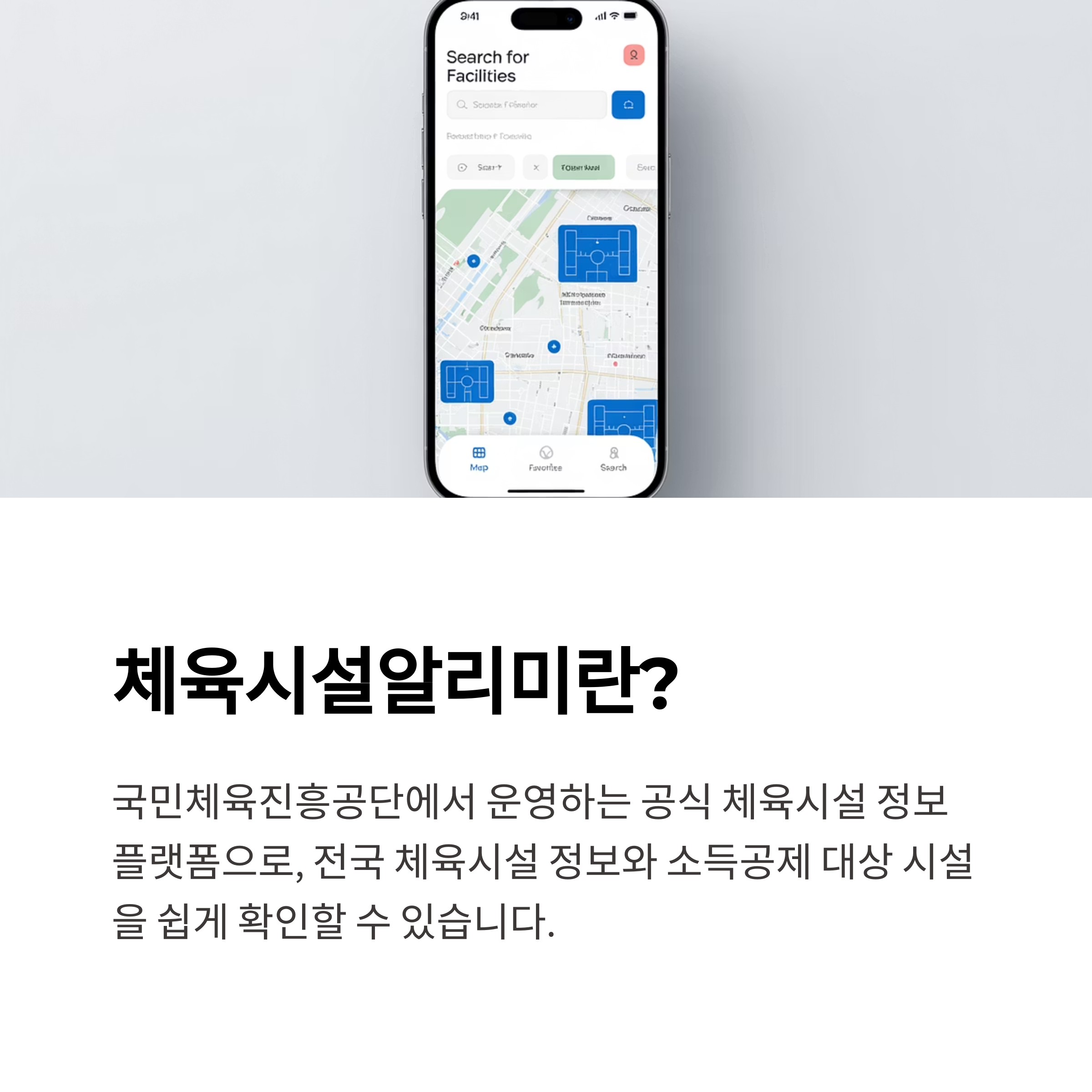 체육시설알리미는 국민체육진흥공단에서 운영하는 공식 체육시설 정보 제공 플랫폼입니다. 전국의 체육시설 정보를 한눈에 확인할 수 있으며, 안전점검 완료 시설부터 시설별 운영 프로그램까지 다양한 정보를 제공합니다.