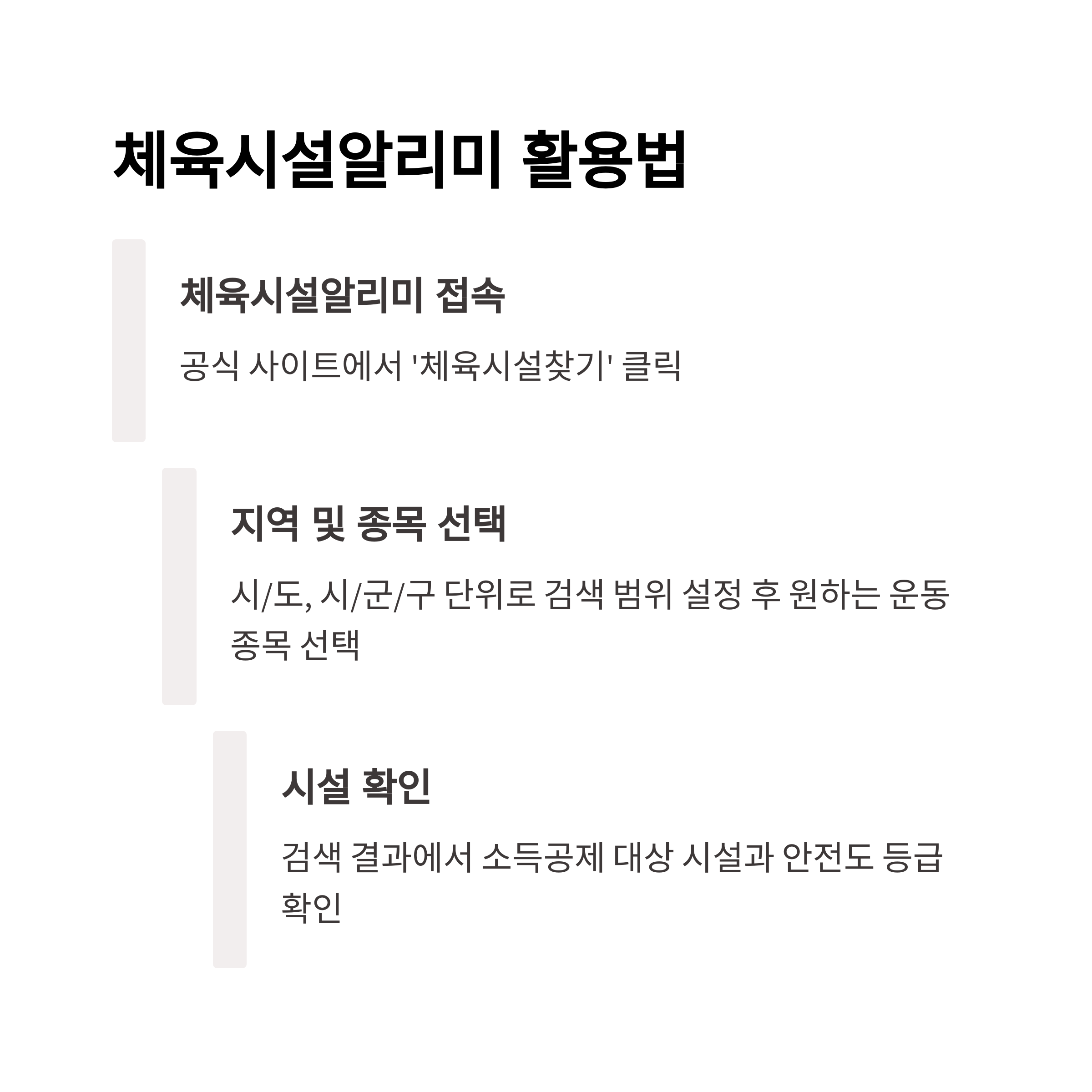 체육시설알리미를 통해 소득공제 대상 체육시설을 미리 확인하고 이용할 수 있습니다. 다음 단계를 따라 원하는 시설을 찾아보세요.