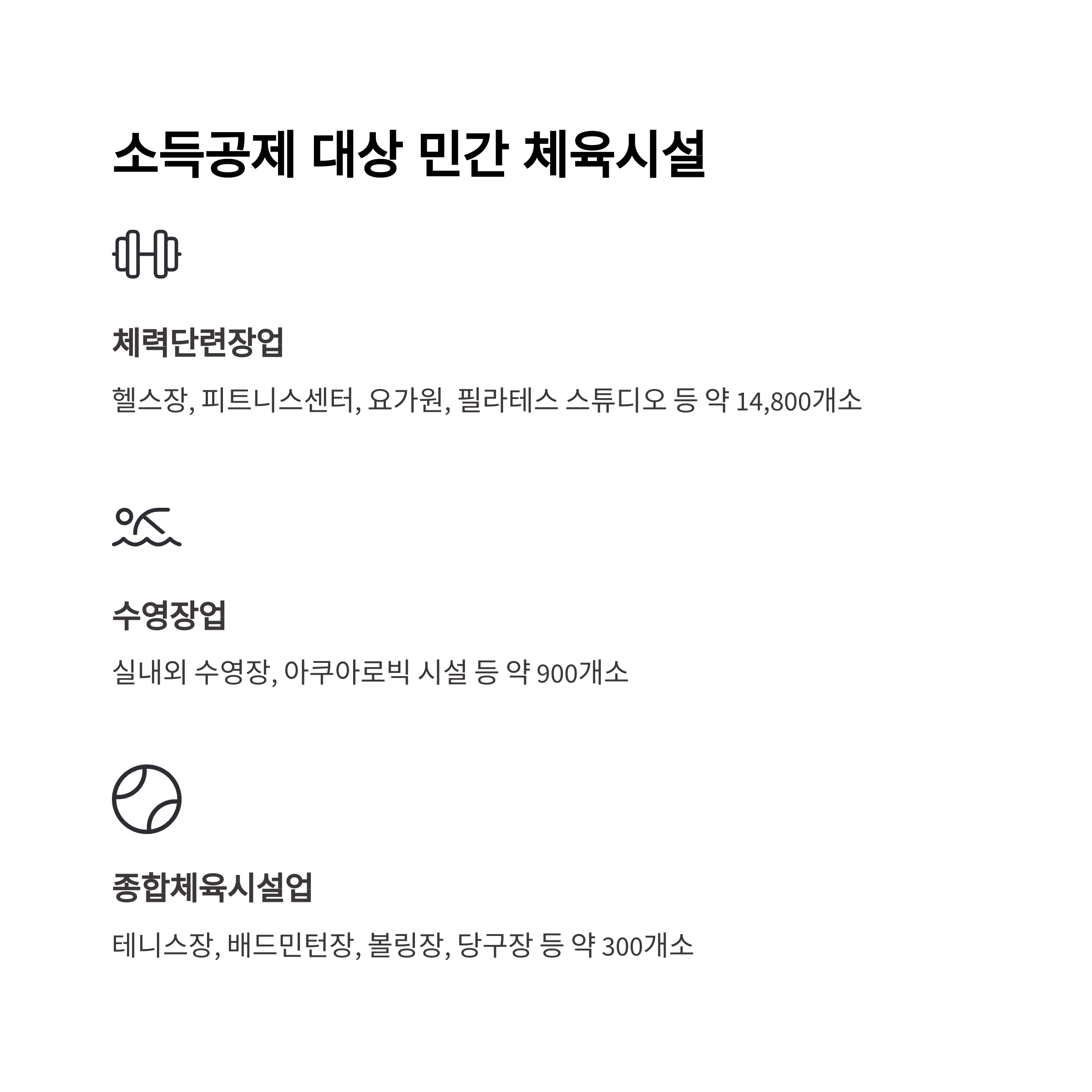 이번 확대로 주민센터 헬스장, 시청 수영장, 테니스장, 볼링장 등 다양한 체육시설에서 이용료의 30%를 소득공제받을 수 있게 되어 국민들의 체육활동 참여를 적극 지원하게 되었습니다.