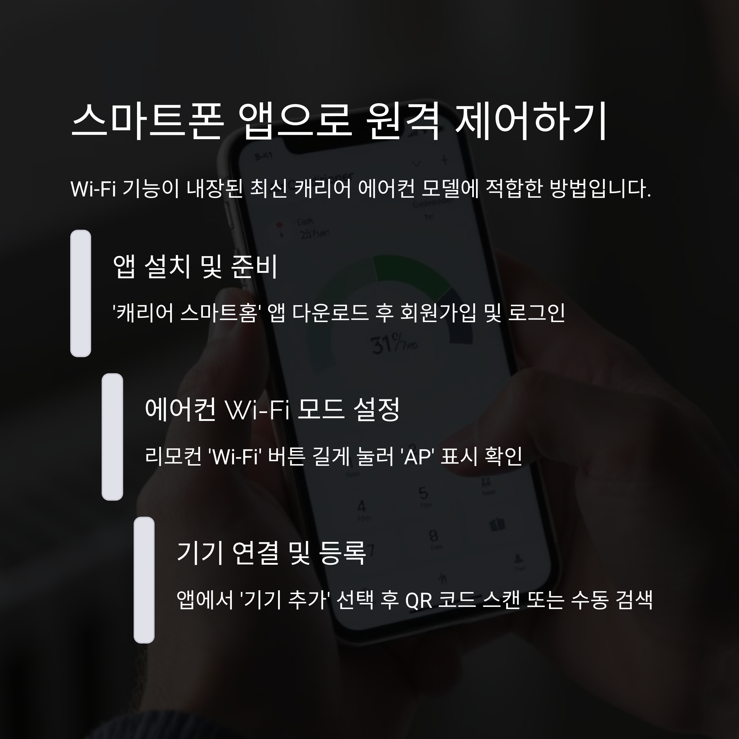 최신 캐리어 에어컨 모델 중 Wi-Fi 기능이 내장된 제품이라면 스마트폰 앱을 통해 완전한 원격 제어가 가능합니다. 이는 가장 편리하고 기능이 풍부한 방법으로, 집 밖에서도 에어컨을 제어할 수 있습니다.