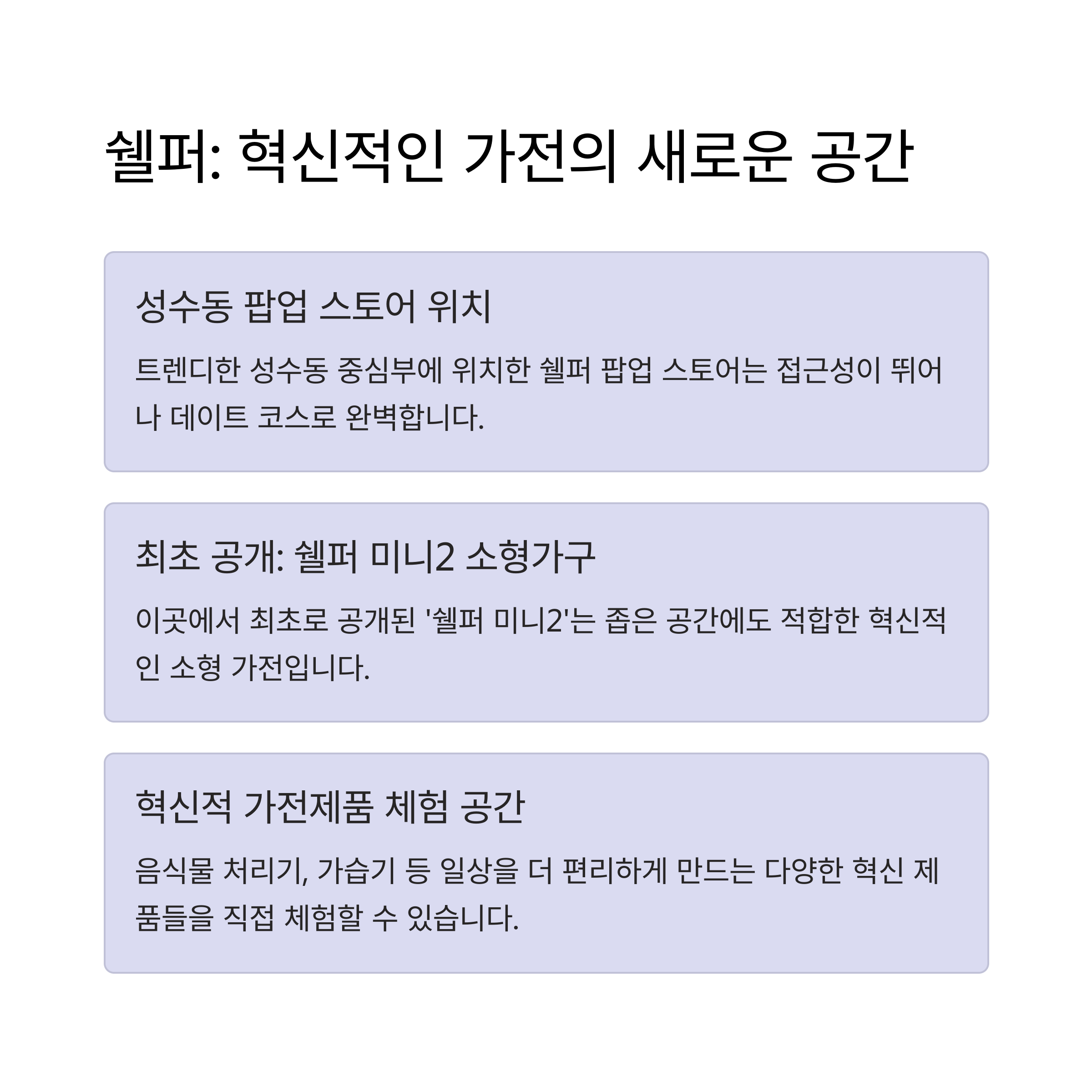 서울의 팝업 스토어 문화는 해가 갈수록 더 다채롭고 창의적인 공간으로 발전하고 있습니다. 특히 데이트 코스를 고민하는 이들에게 팝업 스토어는 단순한 쇼핑 그 이상, 색다른 체험과 감성을 전달하는 매력적인 선택지로 자리잡았는데요. 이번에 방문한 쉘퍼 팝업 스토어는 단순한 가전 브랜드 전시 공간이 아닌, 커플들에게 특별한 시간을 선사하는 체험형 데이트 공간이었습니다. '가사동반자'라는 브랜드 철학 아래, 실용성과 감성을 동시에 갖춘 쉘퍼는 이번 전시에서 최신 제품은 물론, 이벤트와 포토존까지 다채로운 구성으로 방문객의 발길을 사로잡았죠. 특히 쉘퍼 미니2의 최초 공개는 소형가구를 위한 실용적인 솔루션을 제시하며 트렌디한 소비자의 니즈를 정확히 짚어냈습니다. 이번 글에서는 쉘퍼 팝업 스토어의 현장을 생생하게 담아내고, 서울에서 즐길 수 있는 트렌디한 데이트 코스로서의 팝업 스토어 문화에 대해 자세히 소개해드리겠습니다.