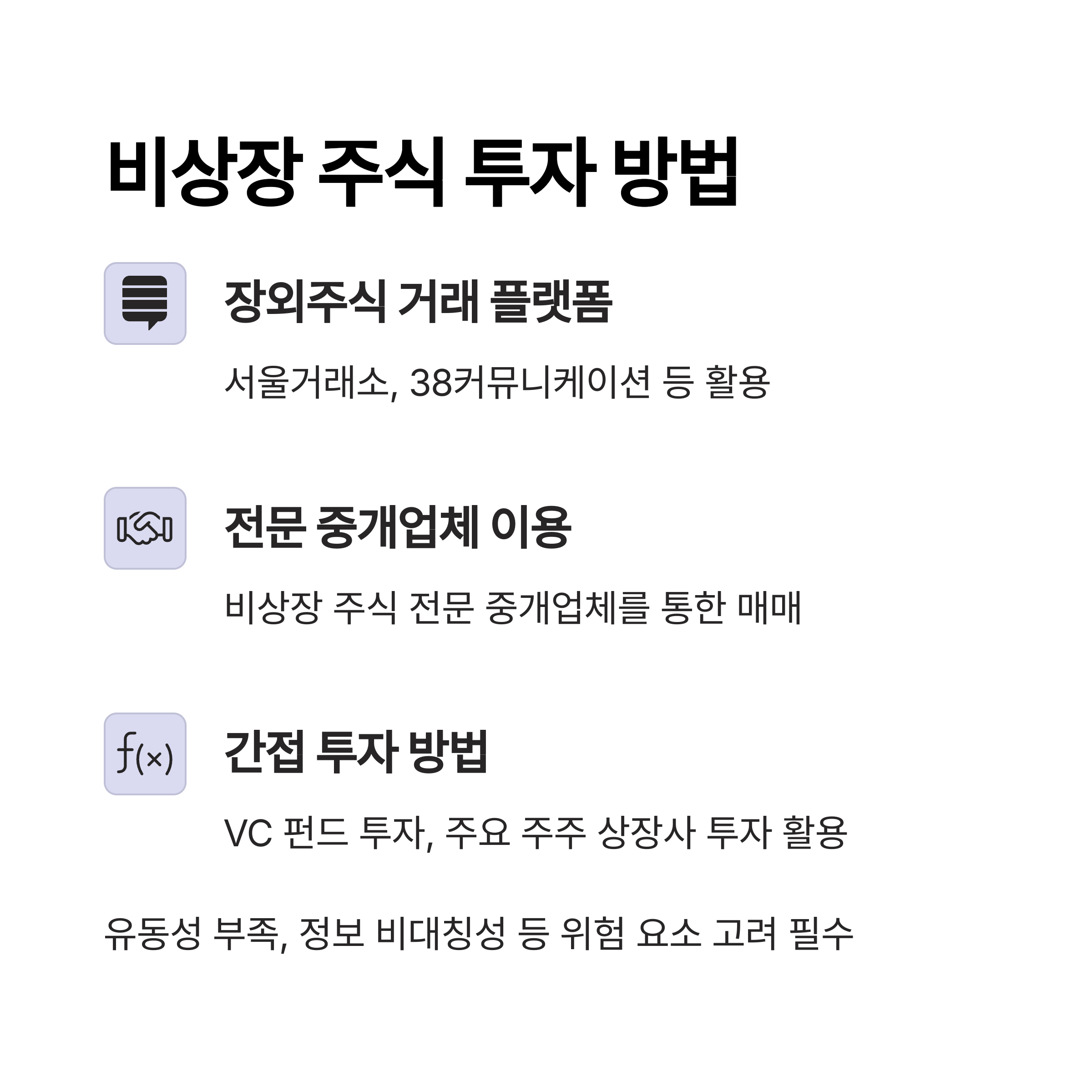 - 비상장 주식 전문 펀드: 비상장 주식에 투자하는 전문 펀드를 통해 간접적으로 투자할 수 있습니다.