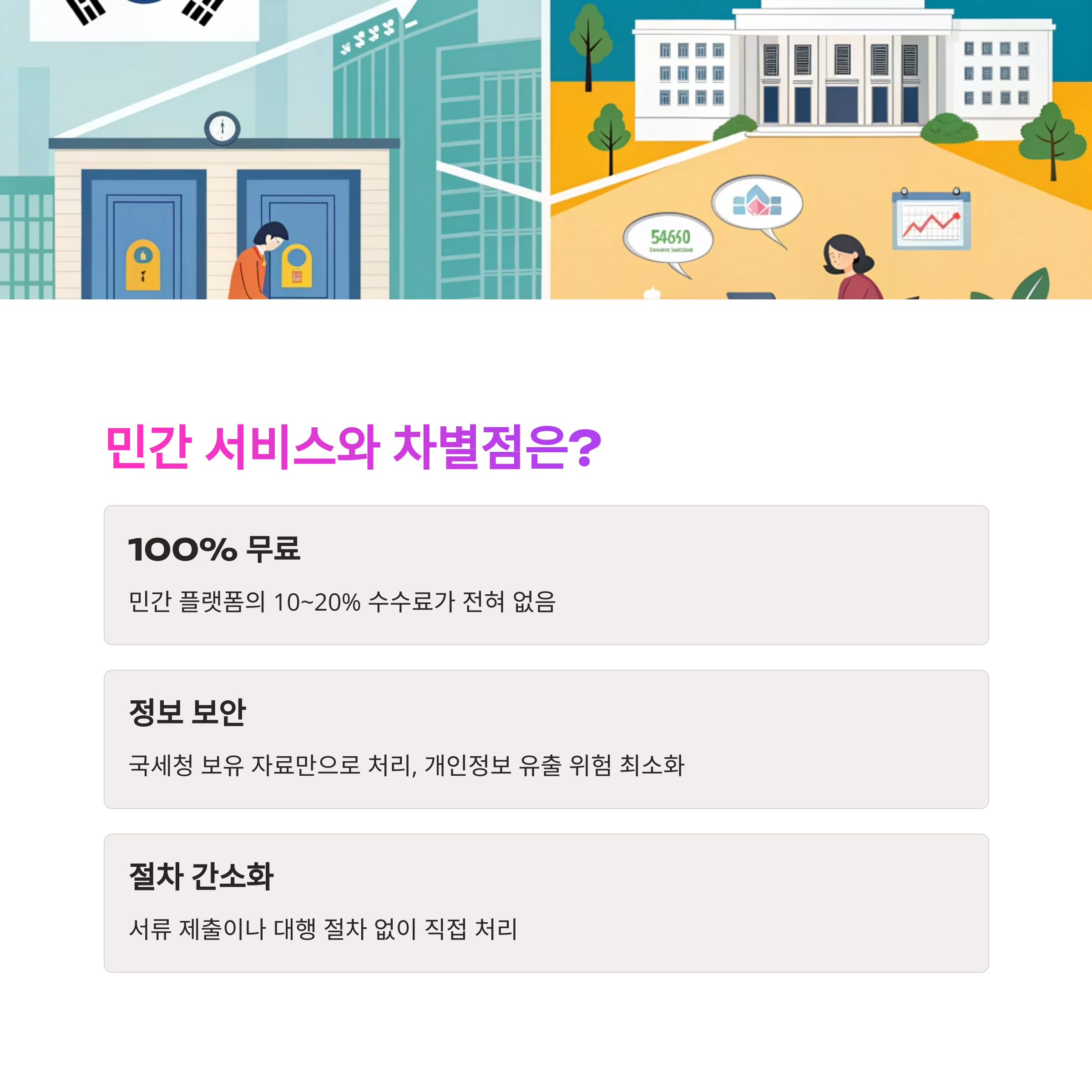 기존 민간 세무 플랫폼(삼쩜삼, 토스택스 등)을 이용할 경우 환급 금액의 10~20%를 수수료로 지불해야 했지만, 국세청 원클릭 서비스는 완전 무료입니다. 이를 통해 납세자는 환급금 전액을 받을 수 있습니다.