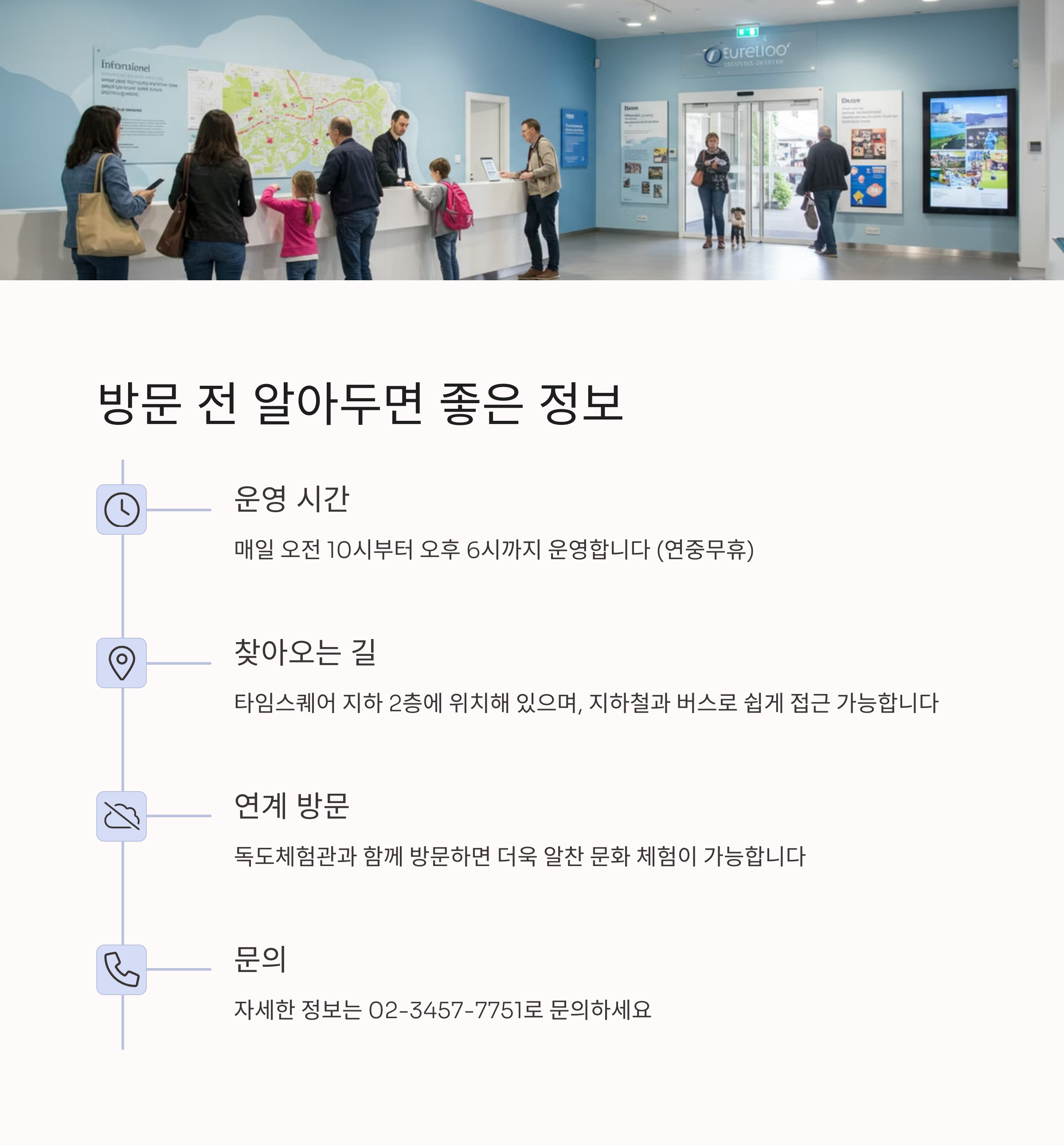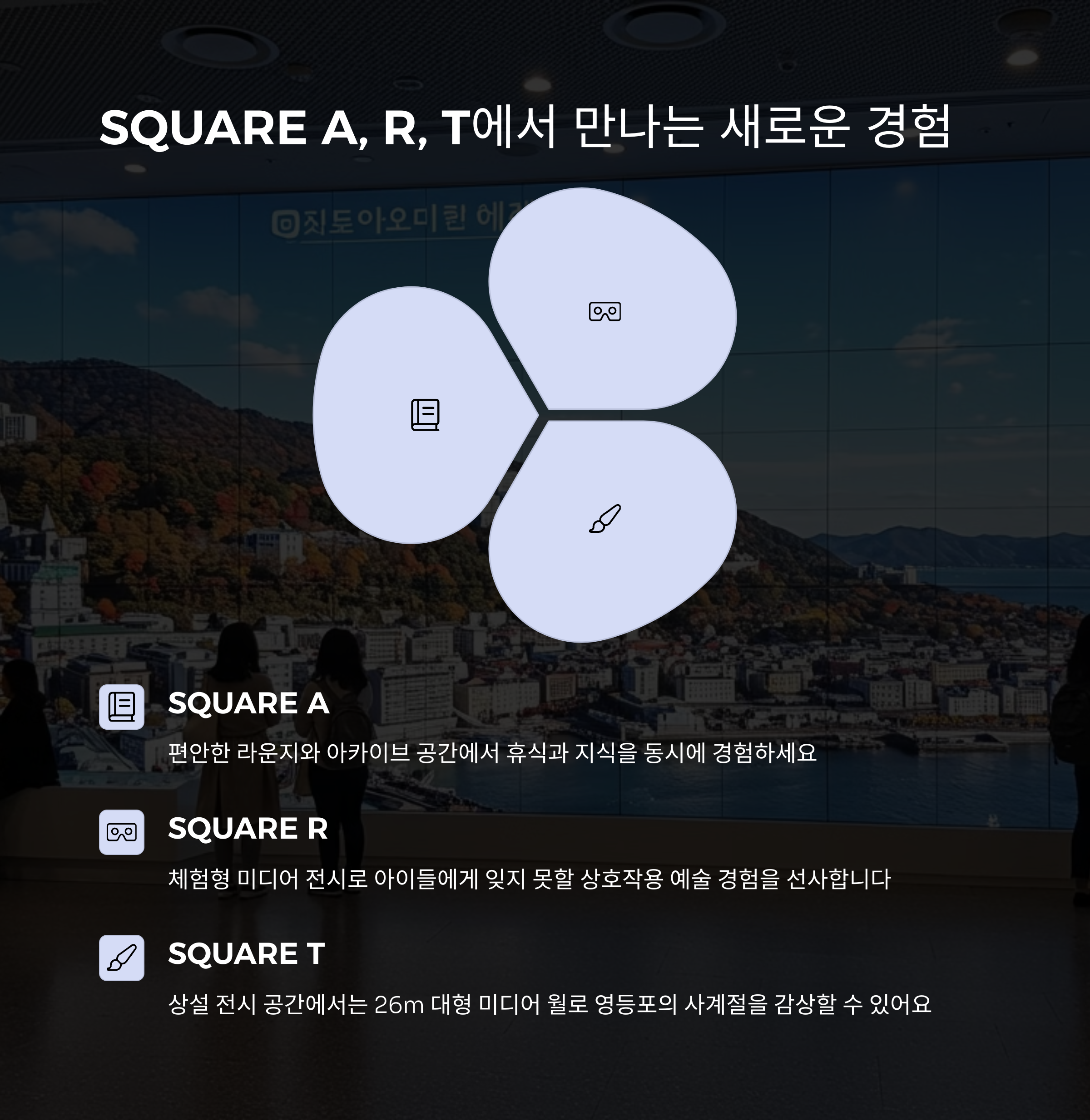 영등포아트스퀘어는 단순히 전시만 즐기는 공간이 아닙니다. 트래블 미디어 데크, 다목적 문화 활동 공간 등 다양한 활동이 가능한 복합 공간으로 구성되어 있습니다. 좌측에는 편안한 라운지와 아카이브 공간이 마련되어 있어 잠시 휴식하며 예술 도서를 살펴볼 수 있으며, 우측에는 아이들이 흥미를 가질 만한 체험형 미디어 전시 공간이 넓게 펼쳐져 있습니다. 독도체험관과 나란히 위치해 있기 때문에 두 곳을 연계해 방문하면 보다 풍부한 학습 기회가 제공됩니다. 주차는 타임스퀘어 내 유료 주차장 또는 영남공영주차장 이용이 가능하며, 대중교통 접근성도 뛰어나 편리합니다.