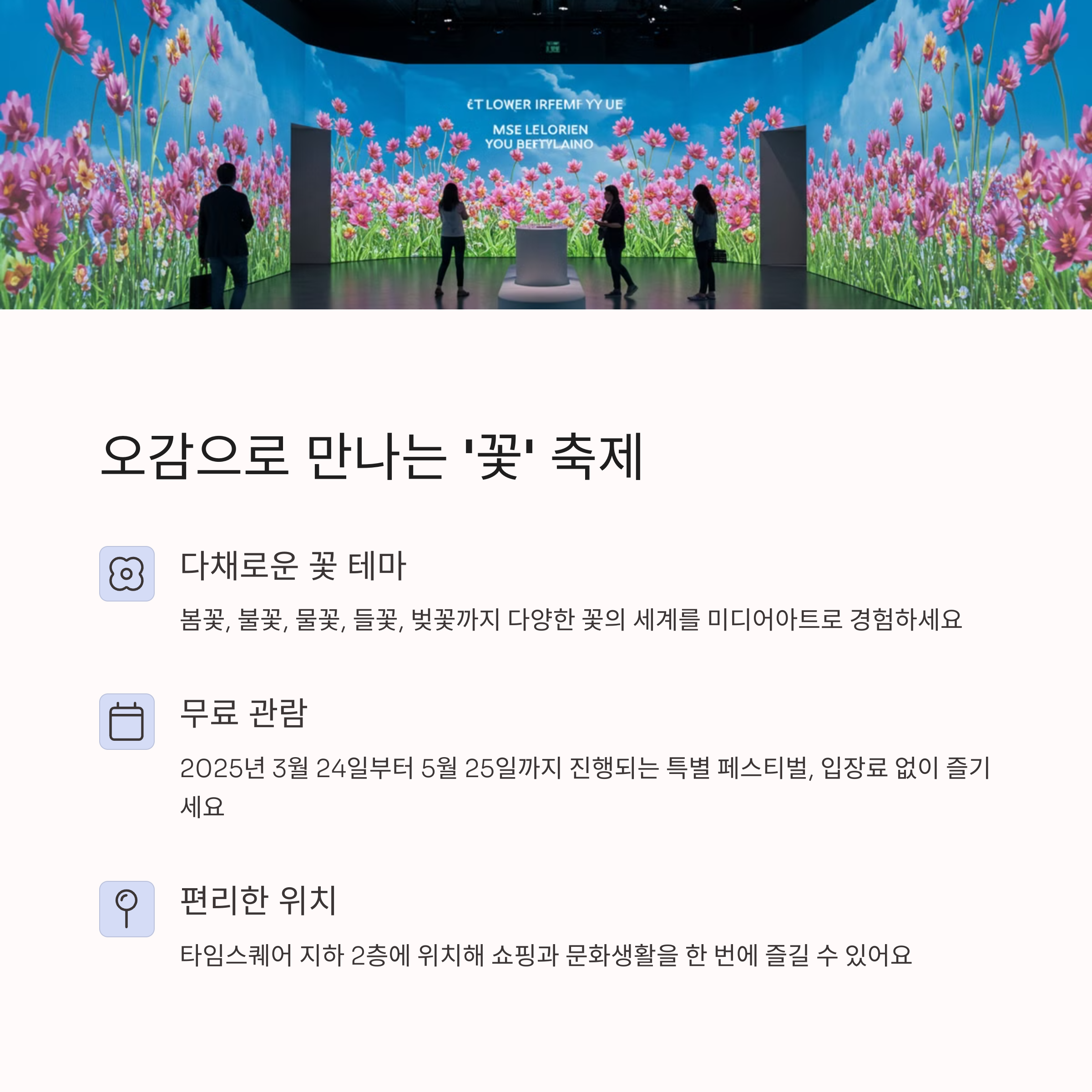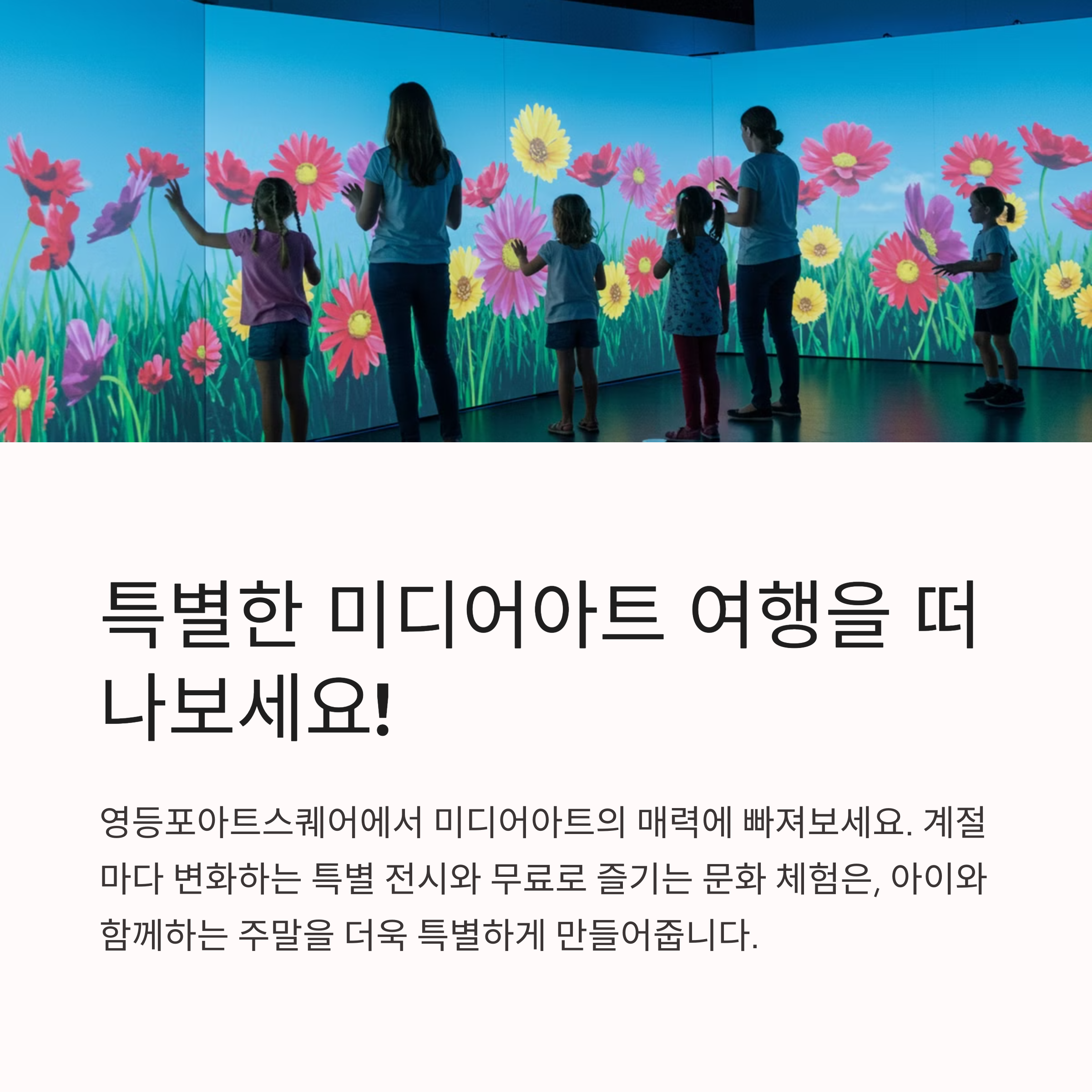 실내에서 아이와 함께 즐길 수 있는 문화 공간을 찾고 계시다면, 영등포아트스퀘어를 주목해보세요. 서울 영등포구청이 조성한 이 공간은 구민에게 다양한 문화 체험의 기회를 제공하기 위해 마련된 복합 문화 공간으로, 타임스퀘어 지하 2층에 위치해 있습니다. 요즘처럼 날씨 변화가 심한 계절에는 실내 문화 체험이 더욱 각광받고 있습니다. 특히 어린이와 가족이 함께 즐길 수 있는 프로그램이 다채롭게 구성되어 있어 주말 나들이 장소로도 손색이 없습니다. 현재는 2025 영등포 미디어아트 페스티벌: 꽃이라는 테마 전시가 한창 진행 중입니다. ‘봄꽃’, ‘불꽃’, ‘물꽃’, ‘들꽃’, ‘벚꽃’을 중심으로 국내 유명 작가들의 예술 세계와 첨단 미디어 기술이 결합된 새로운 전시 경험을 선사하고 있죠. 게다가 상설 전시 공간에서는 영등포 리빙페어, 26미터 미디어월, 다목적 체험 공간 등도 마련되어 있어 방문객에게 풍성한 볼거리와 체험의 기회를 제공합니다. 이번 포스팅에서는 영등포아트스퀘어의 전시 정보부터 공간 구성, 이용 팁까지 꼼꼼하게 안내해드릴게요. 아이와 의미 있는 시간을 보내고 싶은 분들께 특히 추천드립니다.