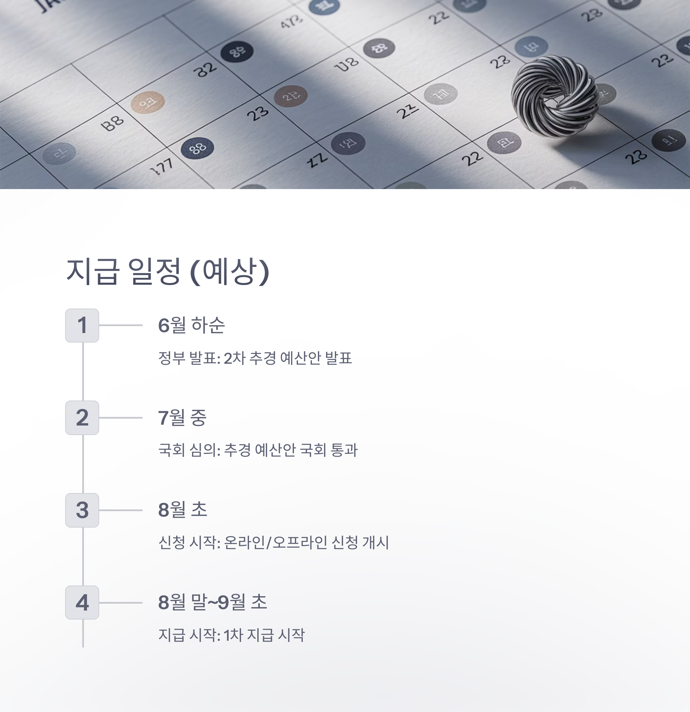 정확한 일정은 정부의 공식 발표를 통해 확인해야 하며, 국회 심의 과정에서 일정이 변경될 수 있습니다. 신청 기간은 일반적으로 1~2개월 정도로 설정되며, 대상자가 많은 점을 고려하여 충분한 기간을 두고 진행될 예정입니다.