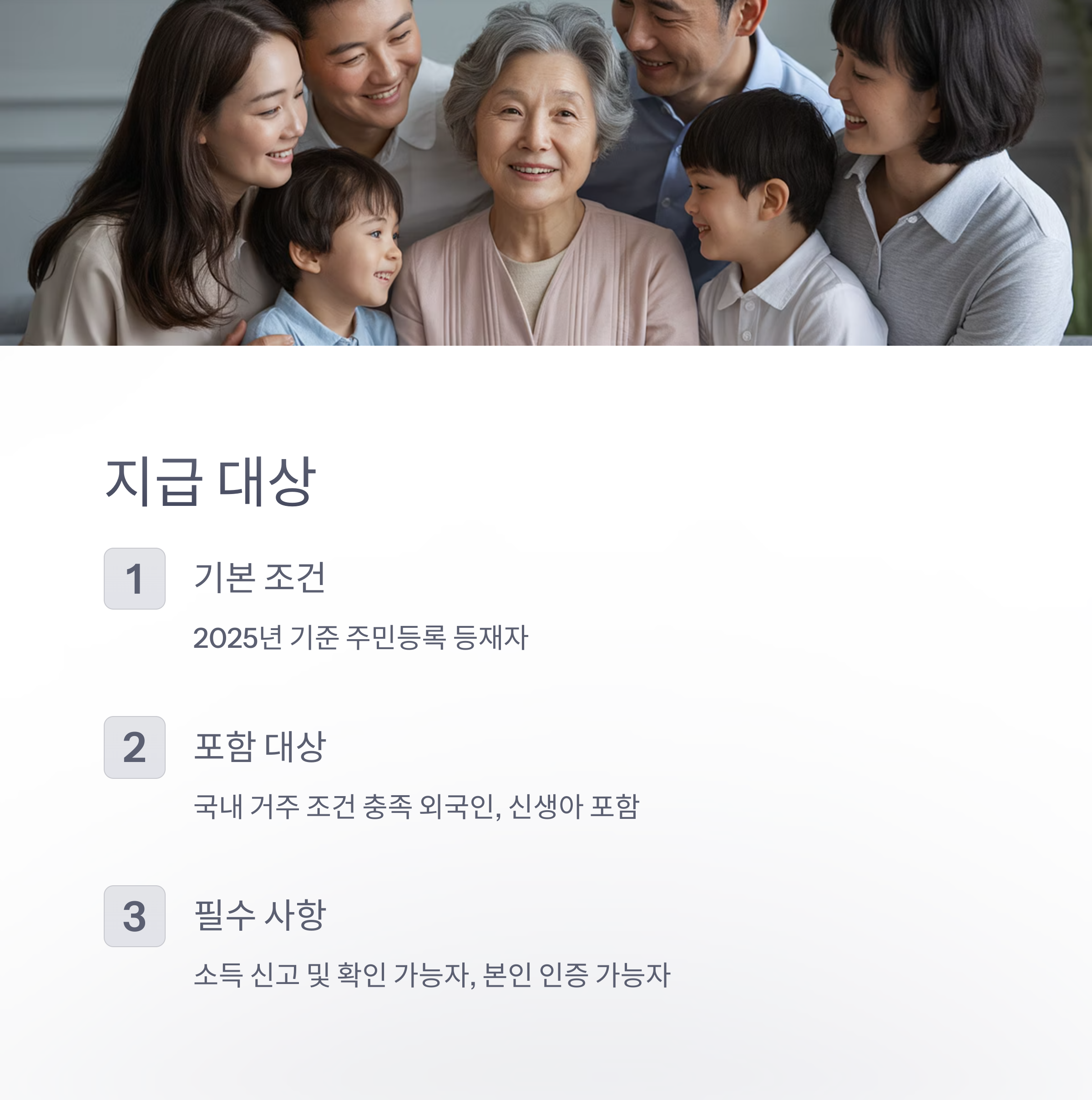 지급 대상은 2025년 기준 주민등록에 등재된 모든 국민이 원칙이며, 일정 기간 이상 국내 거주 조건을 충족하는 외국인도 포함될 가능성이 높습니다. 다만, 정확한 대상자 기준과 소득 구간별 세부 기준은 정부의 공식 발표를 통해 확인해야 합니다.