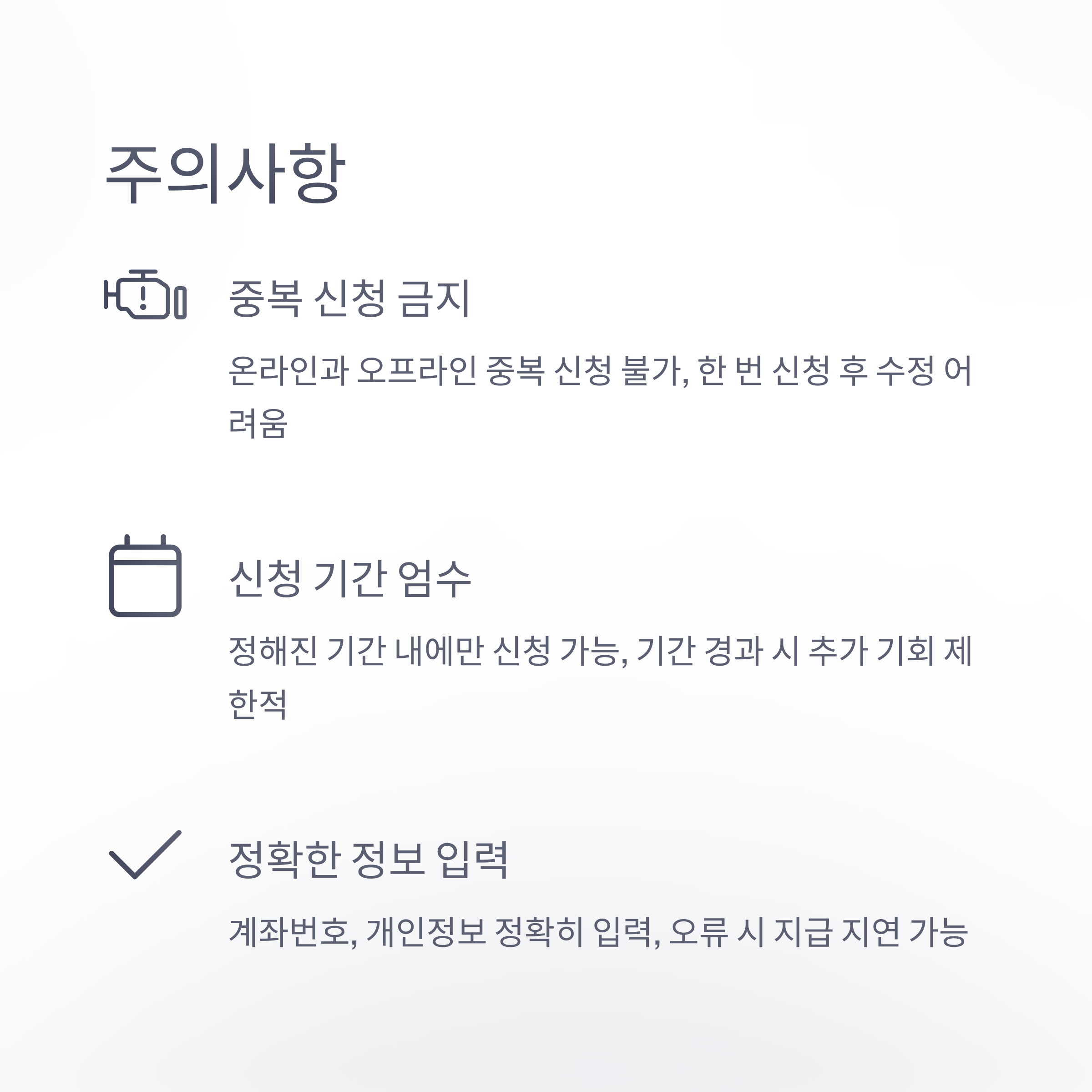 민생회복지원금 신청 시 놓치기 쉬운 주의사항들과 효율적인 신청을 위한 팁을 정리했습니다. 이러한 사항들을 미리 숙지하고 준비하면 신청 과정에서 발생할 수 있는 문제를 예방하고 더욱 원활하게 지원금을 받을 수 있습니다.