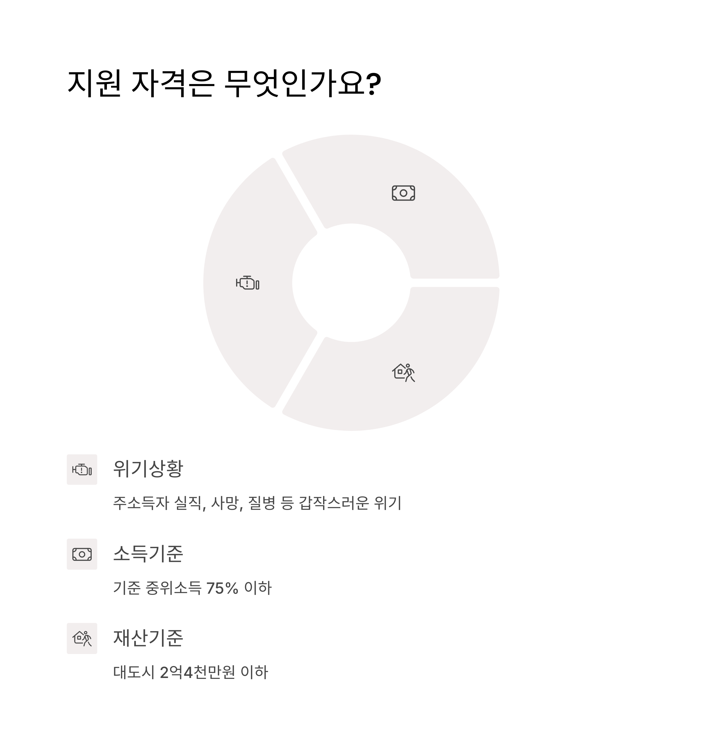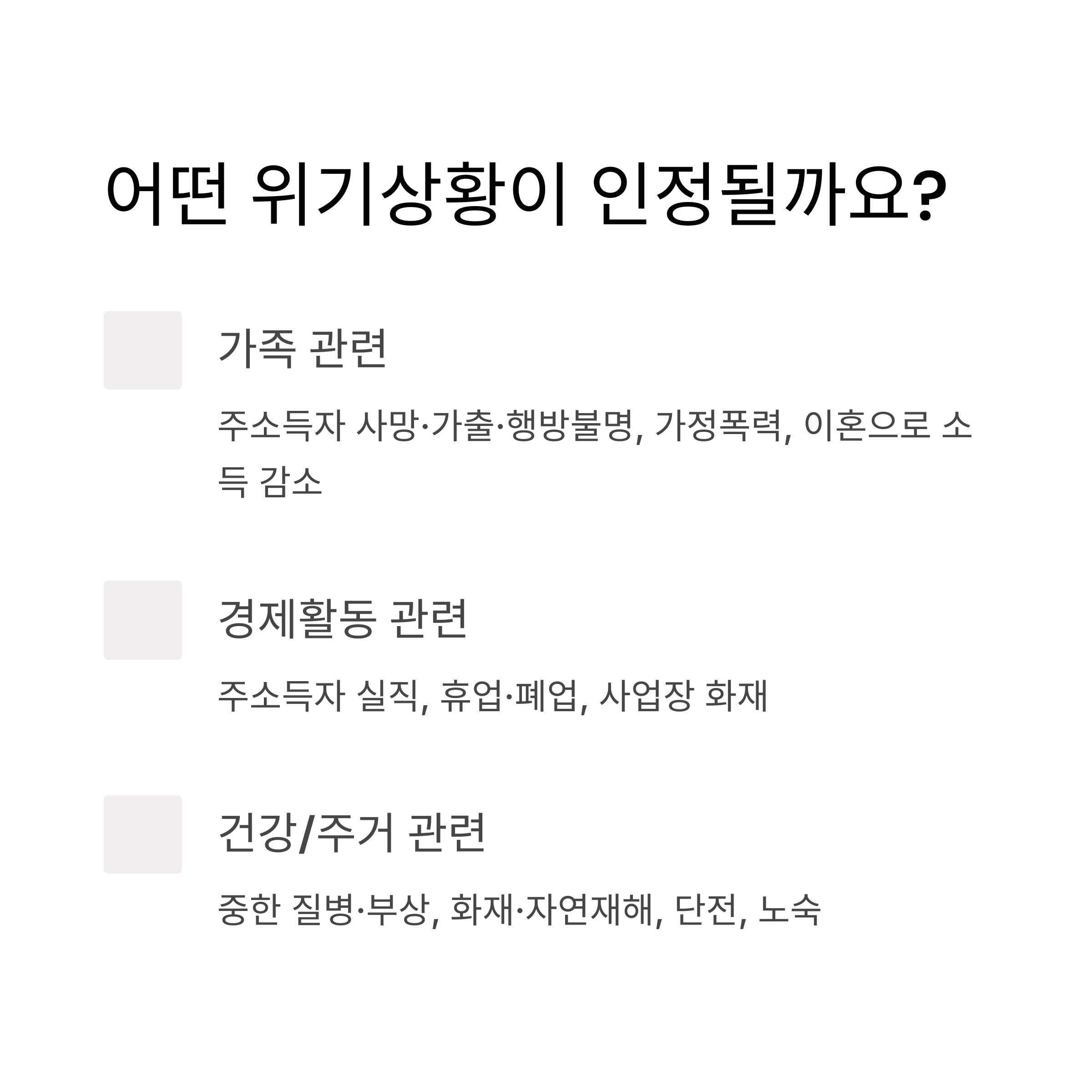 주소득자 실직, 사망, 질병 등 갑작스러운 위기상황으로 생계유지가 어려운 경우