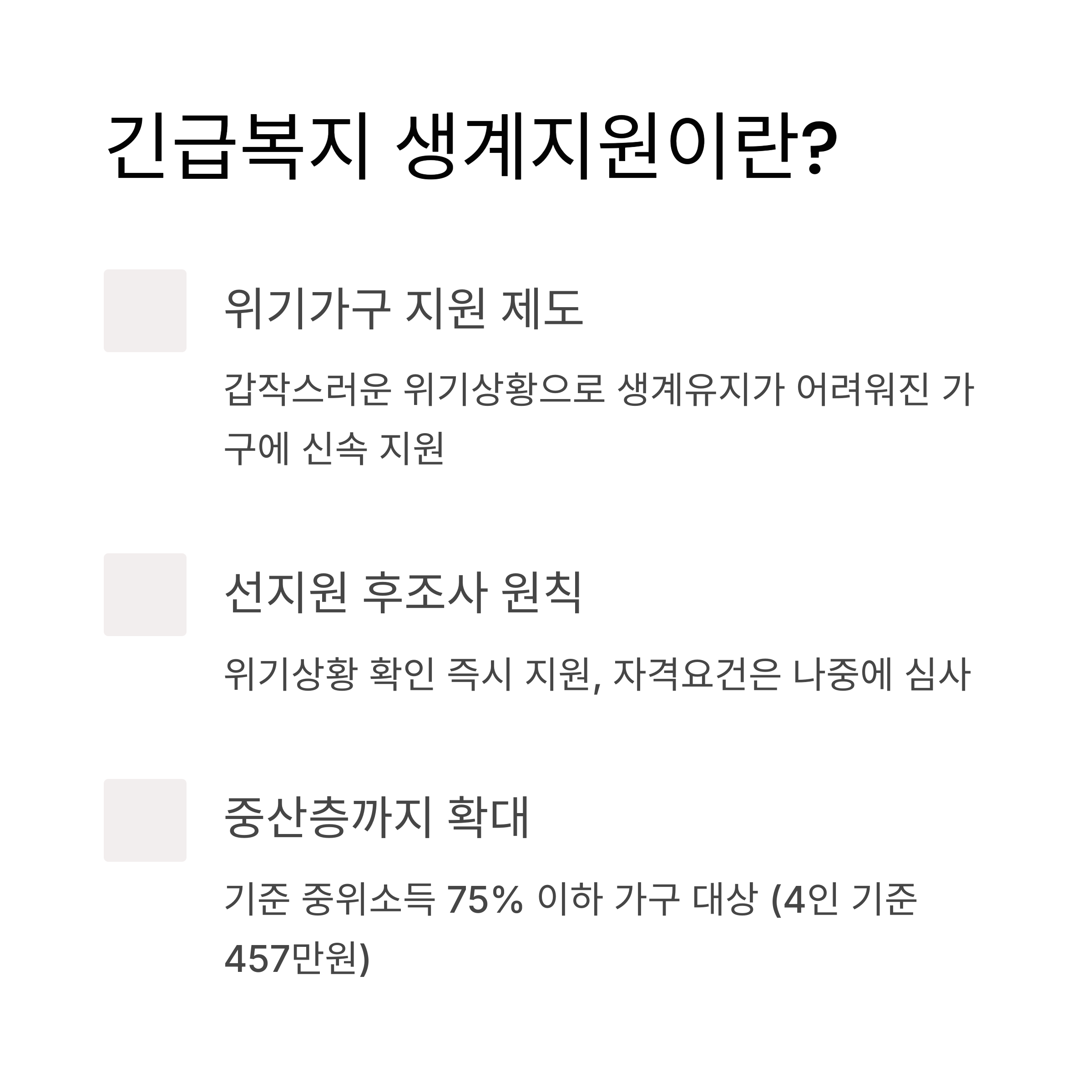 긴급복지 생계지원의 가장 큰 특징은 '선지원 후조사' 원칙입니다. 위기상황이 확인되면 먼저 지원하고 나중에 자격 요건을 심사하여, 진짜 도움이 필요한 순간에 신속하게 지원을 받을 수 있습니다.