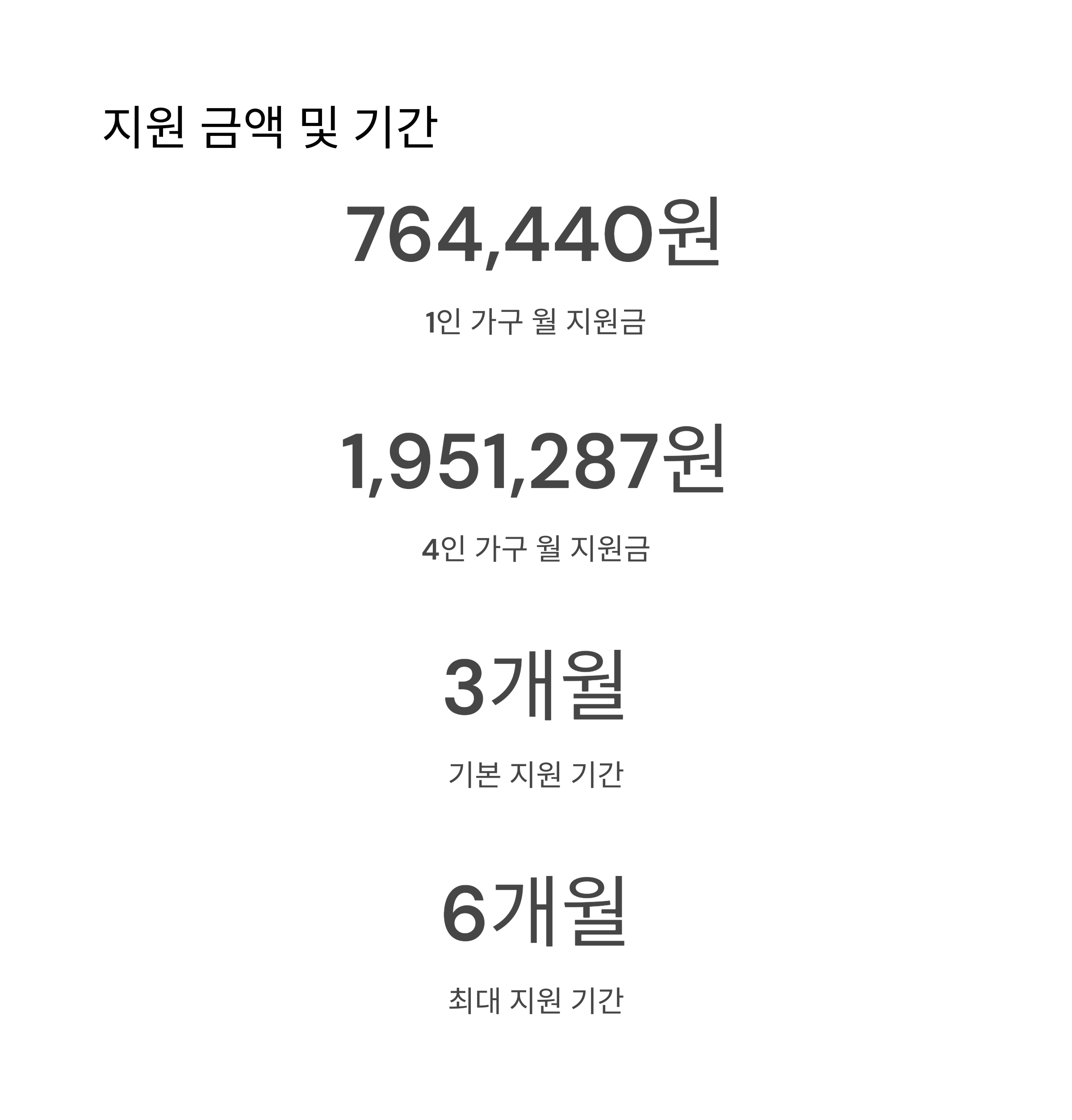 - 생계지원: 기본 3개월 → 연장 3개월 → 최대 6개월