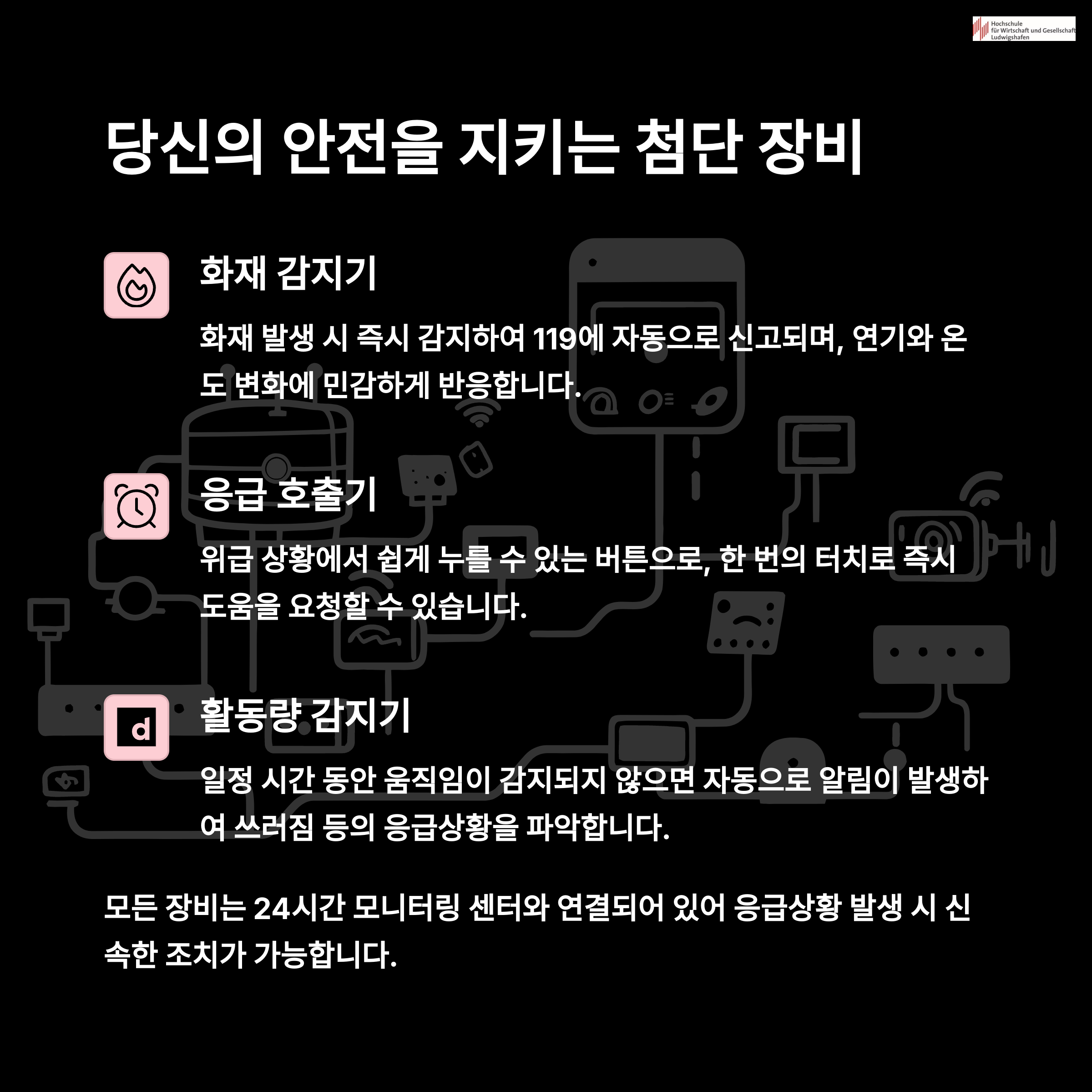 - 응급 호출: 화장실이나 침실에 설치된 호출기로 버튼 또는 음성으로 신고 가능.