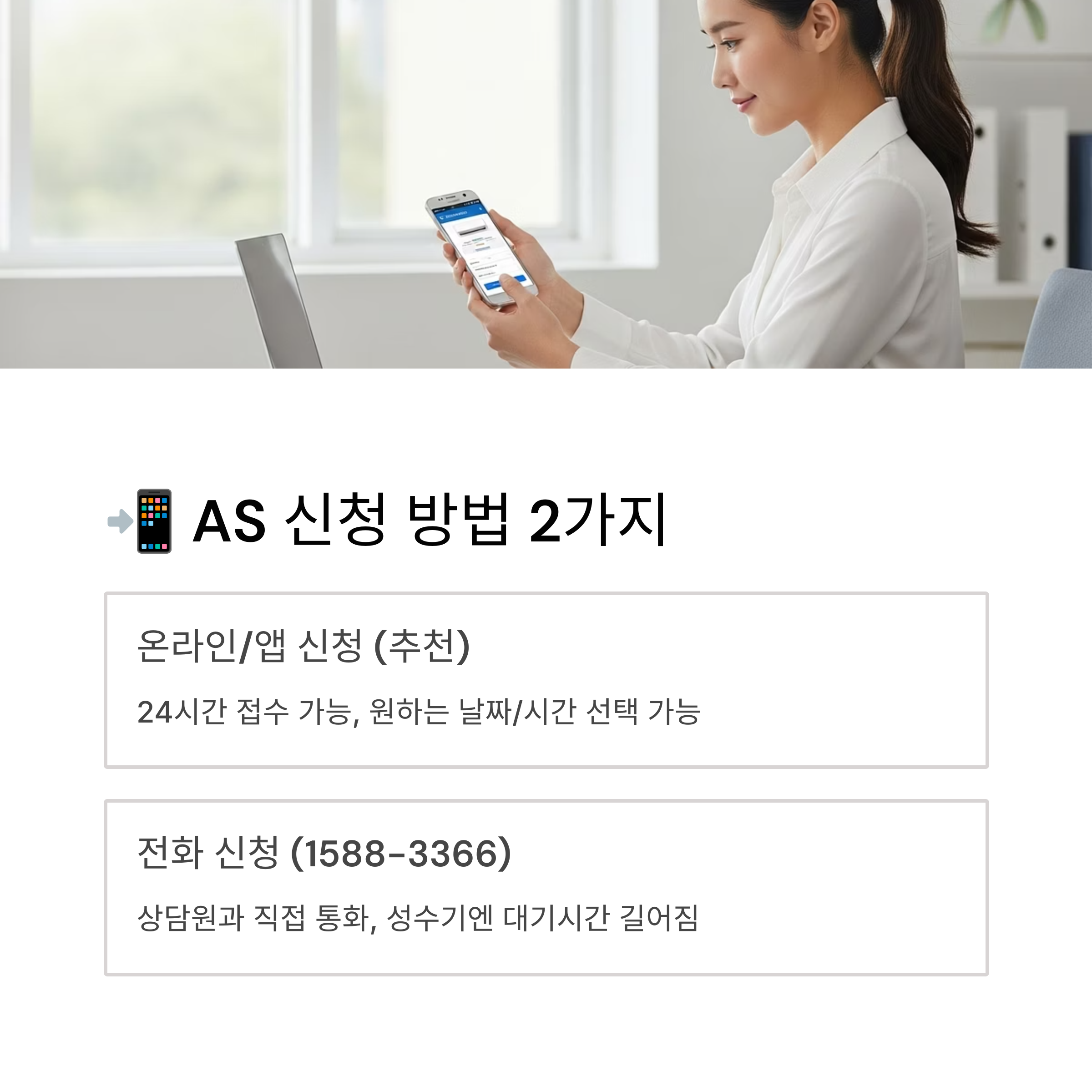 AS 신청 방법은 크게 두 가지가 있습니다. 여름 성수기에는 전화 연결이 어려울 수 있으니 가급적 온라인/앱 접수를 추천합니다.