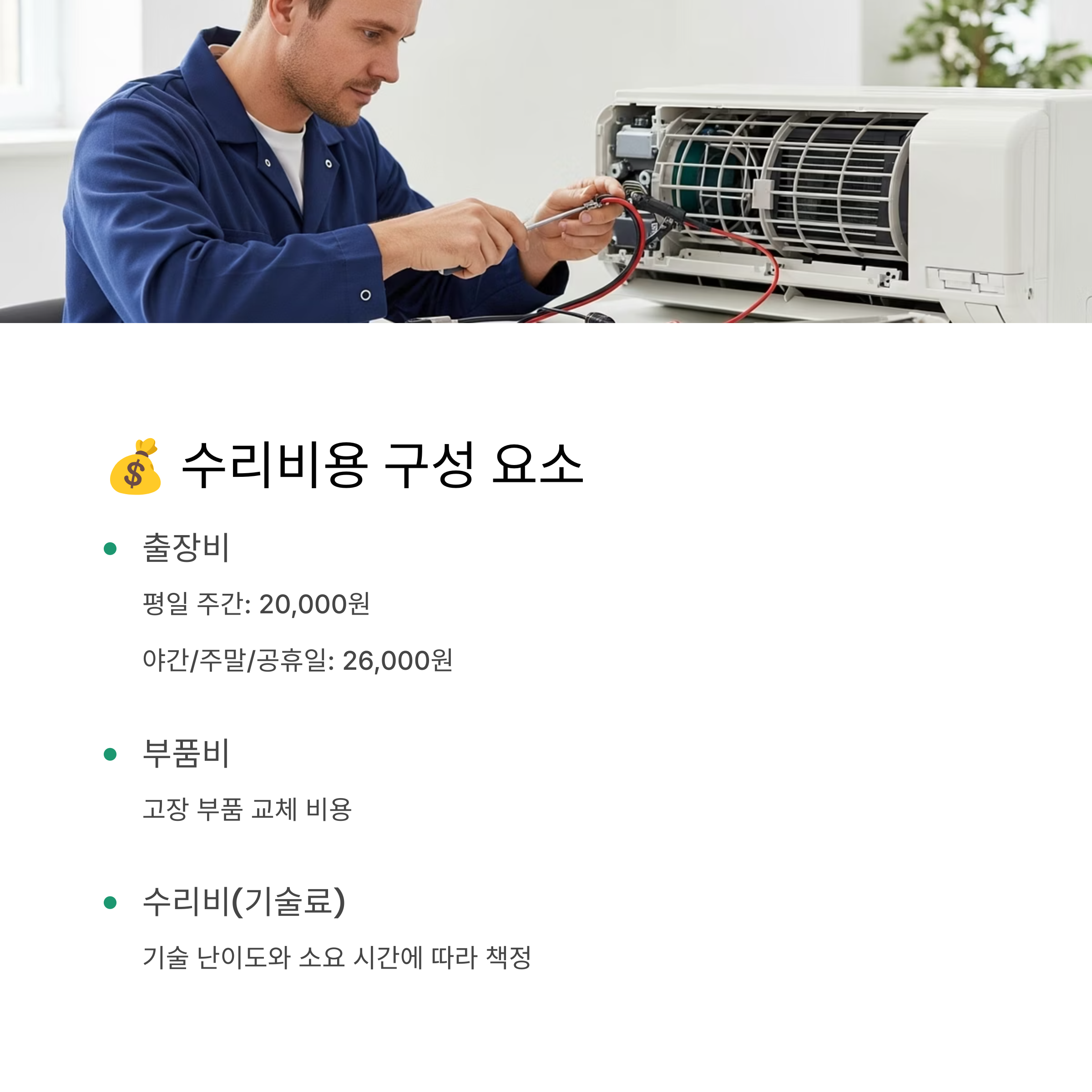 - ① 출장비: 엔지니어가 방문하는 것 자체에 대해 청구되는 비용입니다. 수리를 받지 않더라도, 제품 고장이 아닌 환경 문제(차단기 내려감 등)로 확인되어도 기본적으로 발생합니다.