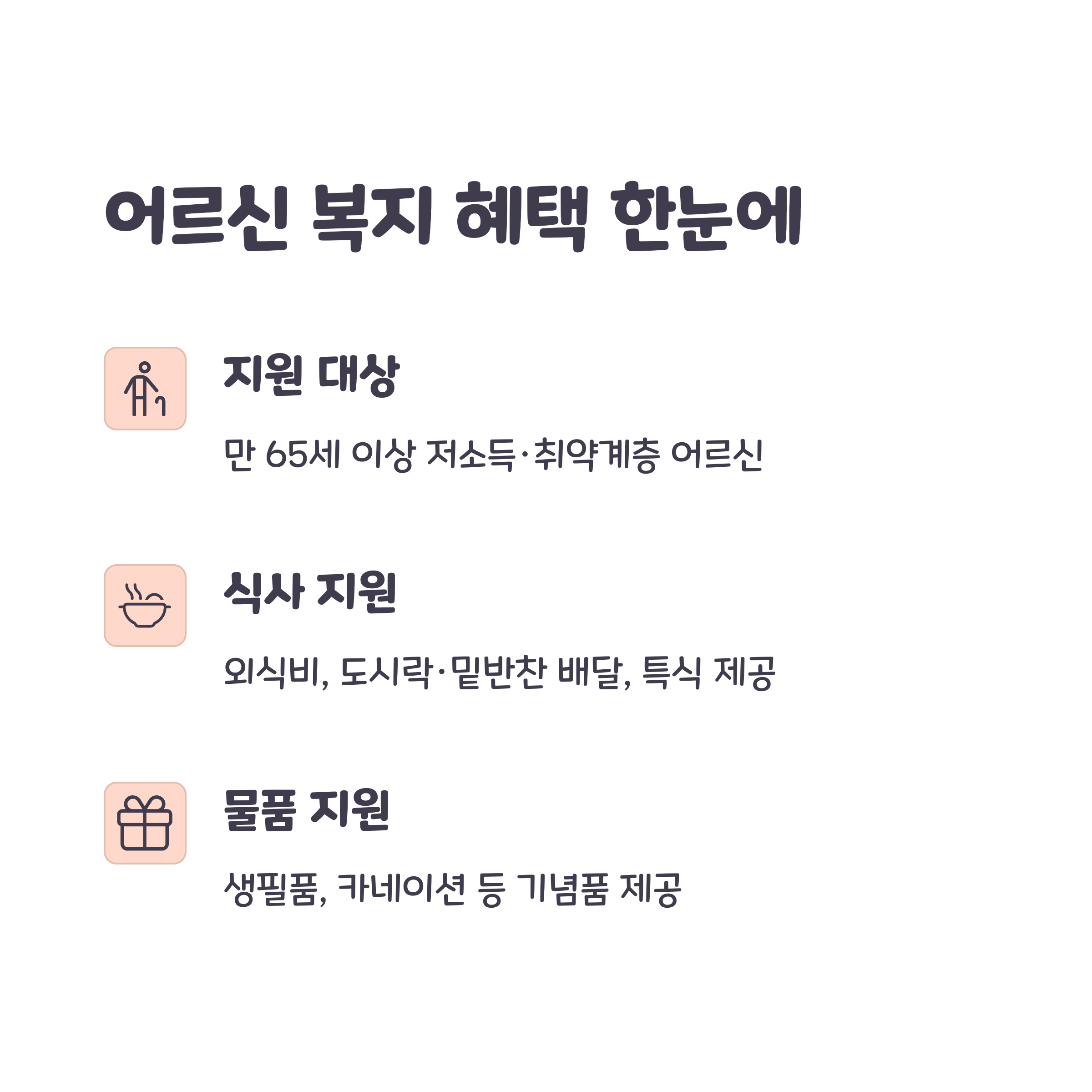 - 지원 내용: 어버이날 물품, 여름나기 물품, 방한용품, 김장김치, 반찬 지원, 추석 물품 지원