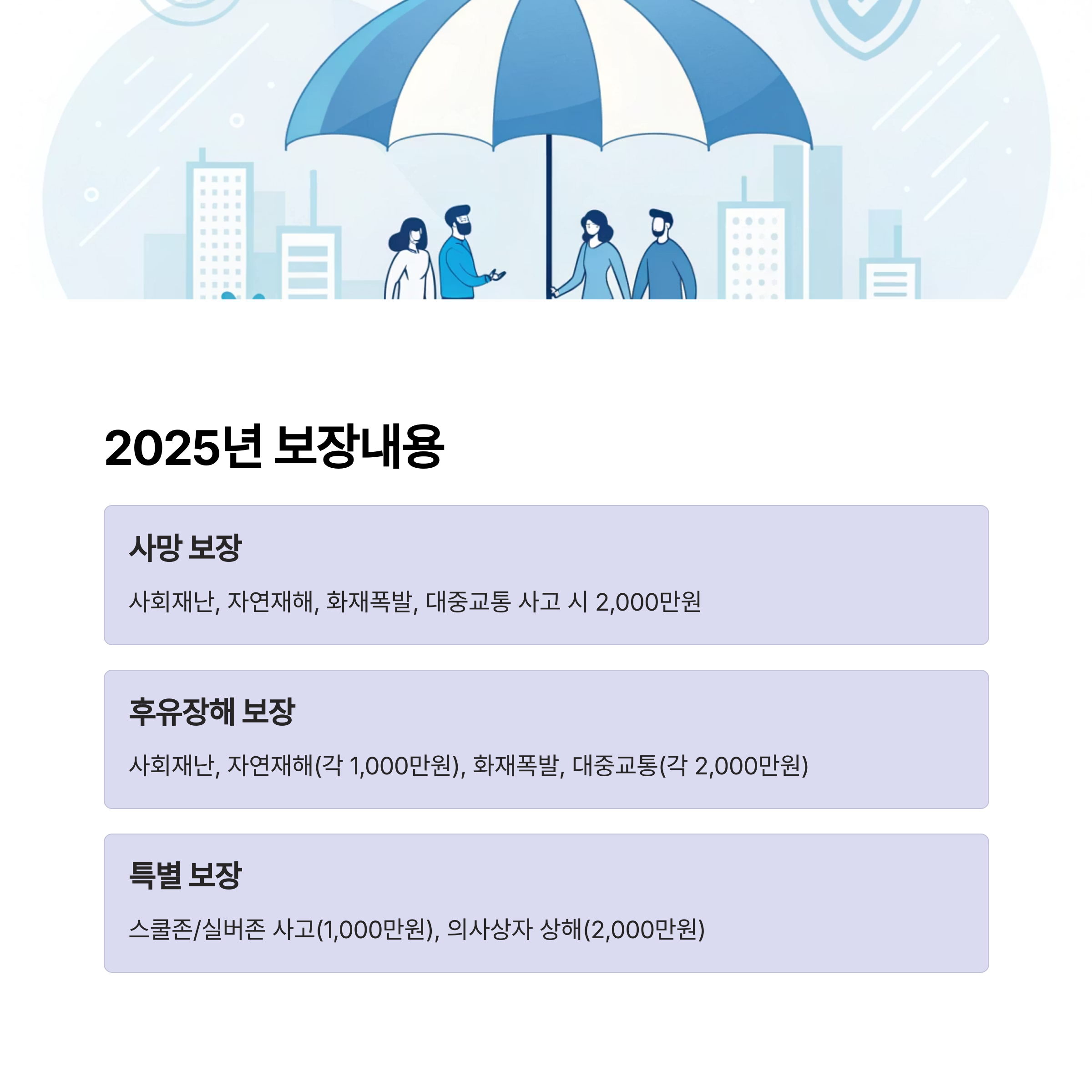 | 보장 내용 | 사망: 사회재난, 자연재해, 화재·폭발·붕괴사고, 대중교통 이용중 상해 - 2,000만원 후유장해: 자연재해(500만원 한도), 화재·폭발·붕괴사고, 대중교통 이용중 상해 - 2,000만원 한도 부상치료비: 스쿨존·실버존 교통사고(1~14급) - 1,000만원 한도 보상금: 의사상자 상해 - 2,000만원 한도 |