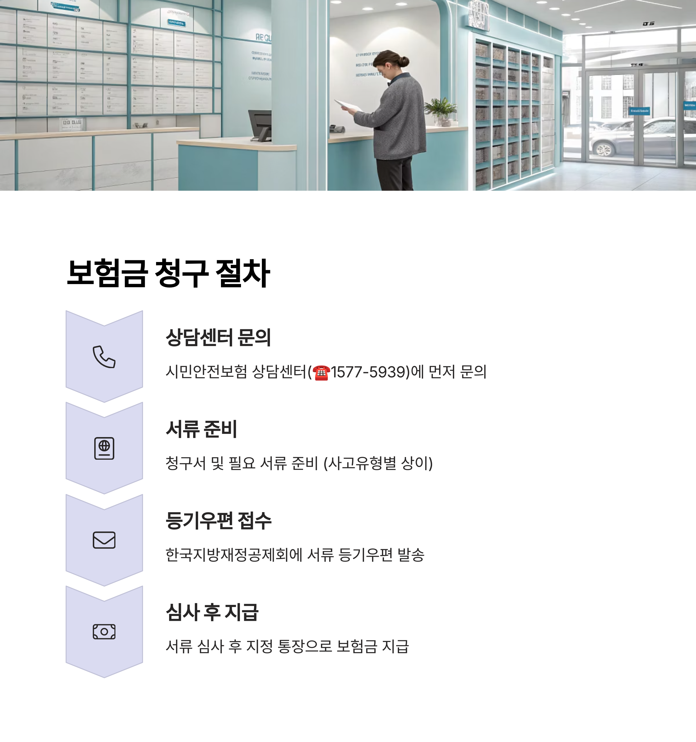 보장항목에 해당하는 사고 발생 시 시민안전보험 상담센터(☎1577-5939)에 먼저 문의합니다.