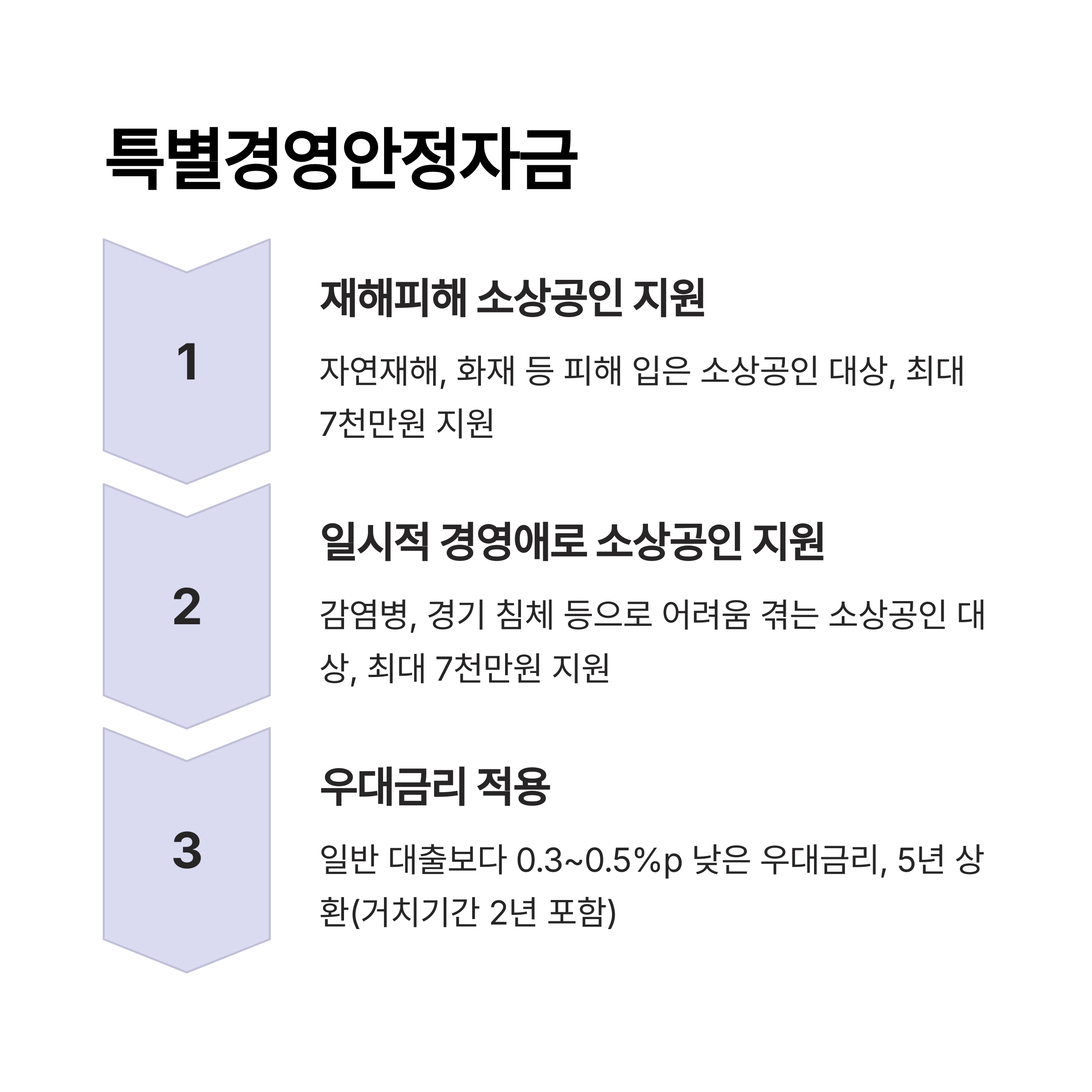 - 특별경영안정자금: 재해 피해, 일시적 경영애로 등 특별 상황에 처한 소상공인 대상