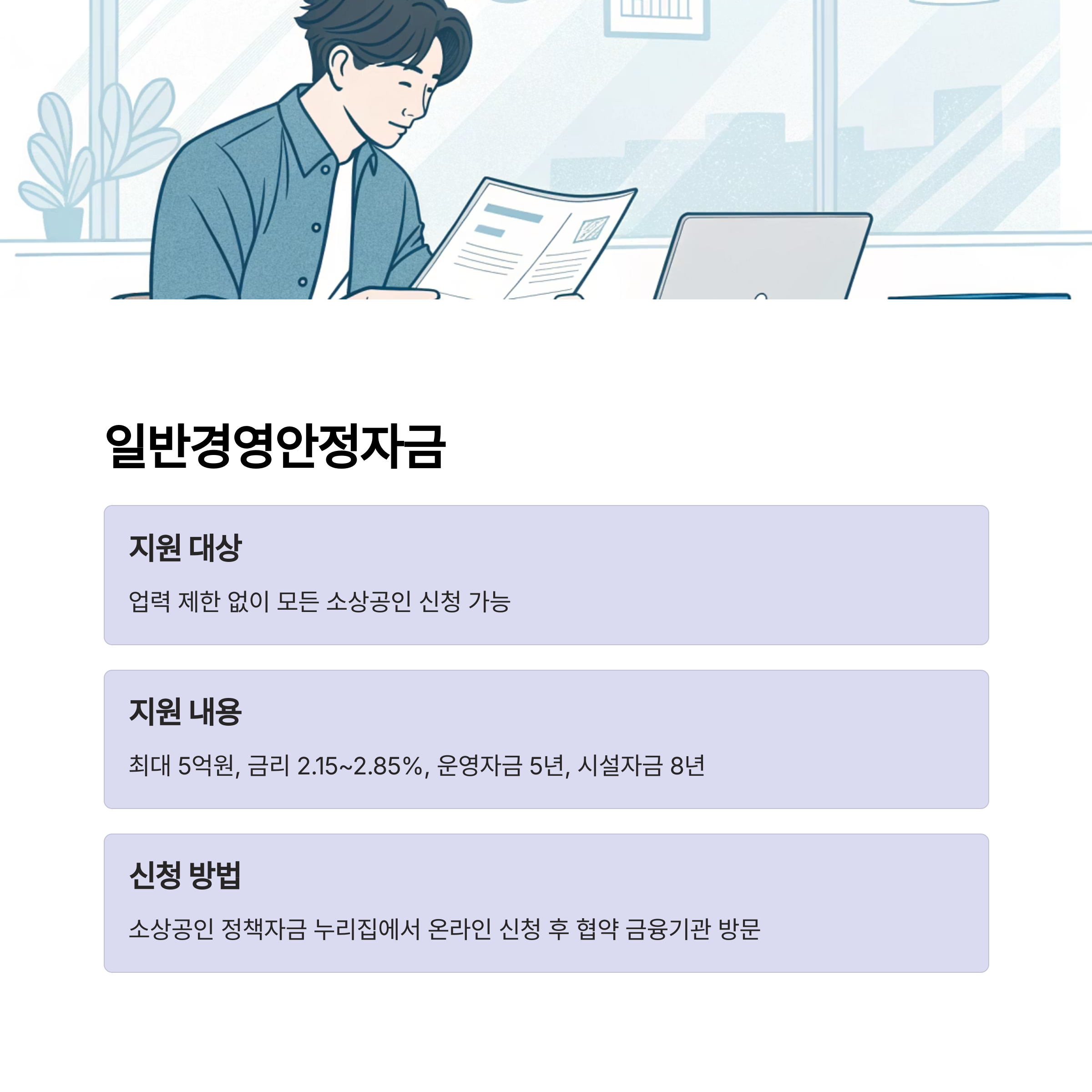 - 일반경영안정자금: 업력에 상관없이 모든 소상공인이 신청 가능, 최대 5억원 지원