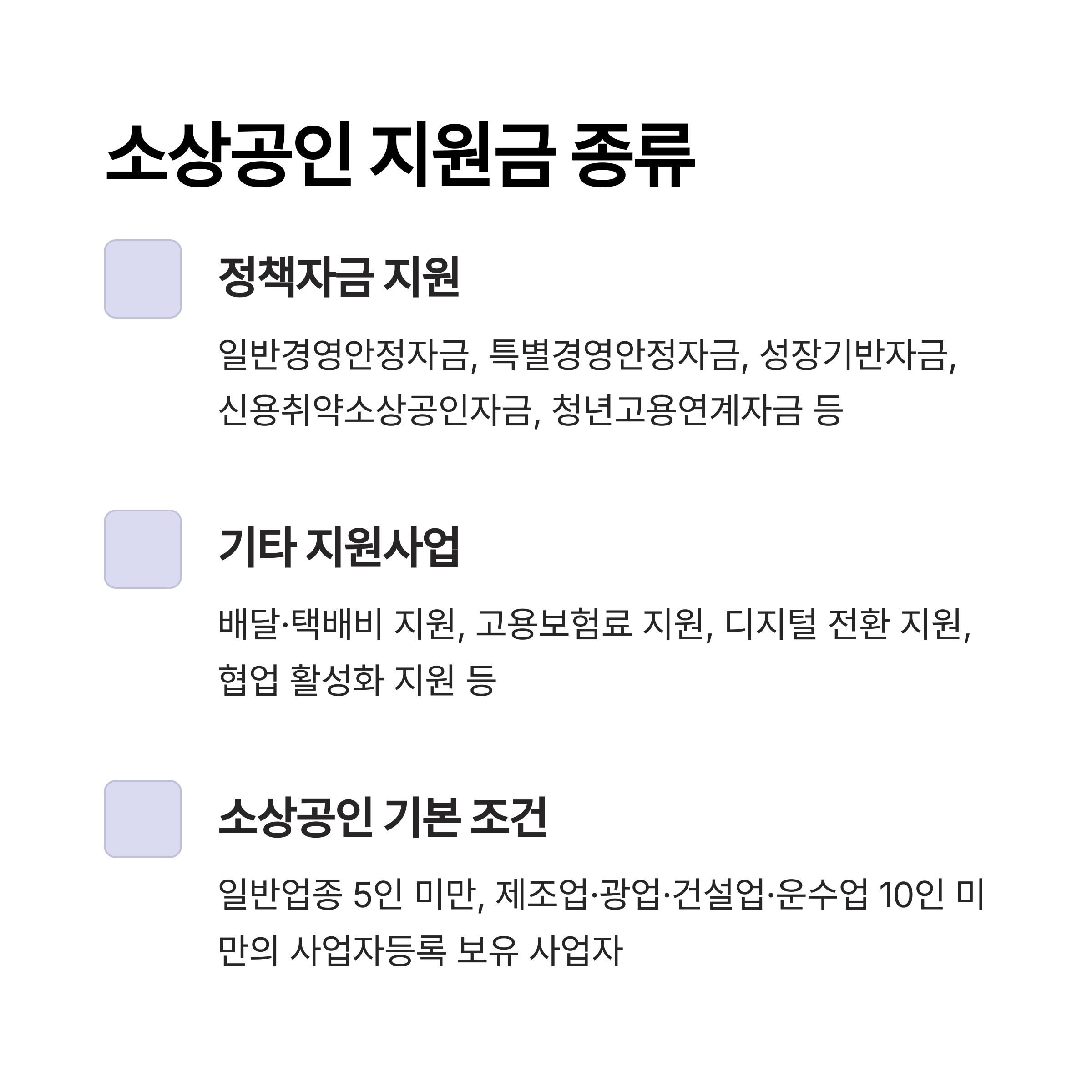 2025년 소상공인 지원금은 다양한 종류가 있으며, 각 지원금마다 신청 조건과 지원 내용이 다릅니다. 주요 지원금 종류와 기본적인 조건을 살펴보겠습니다.