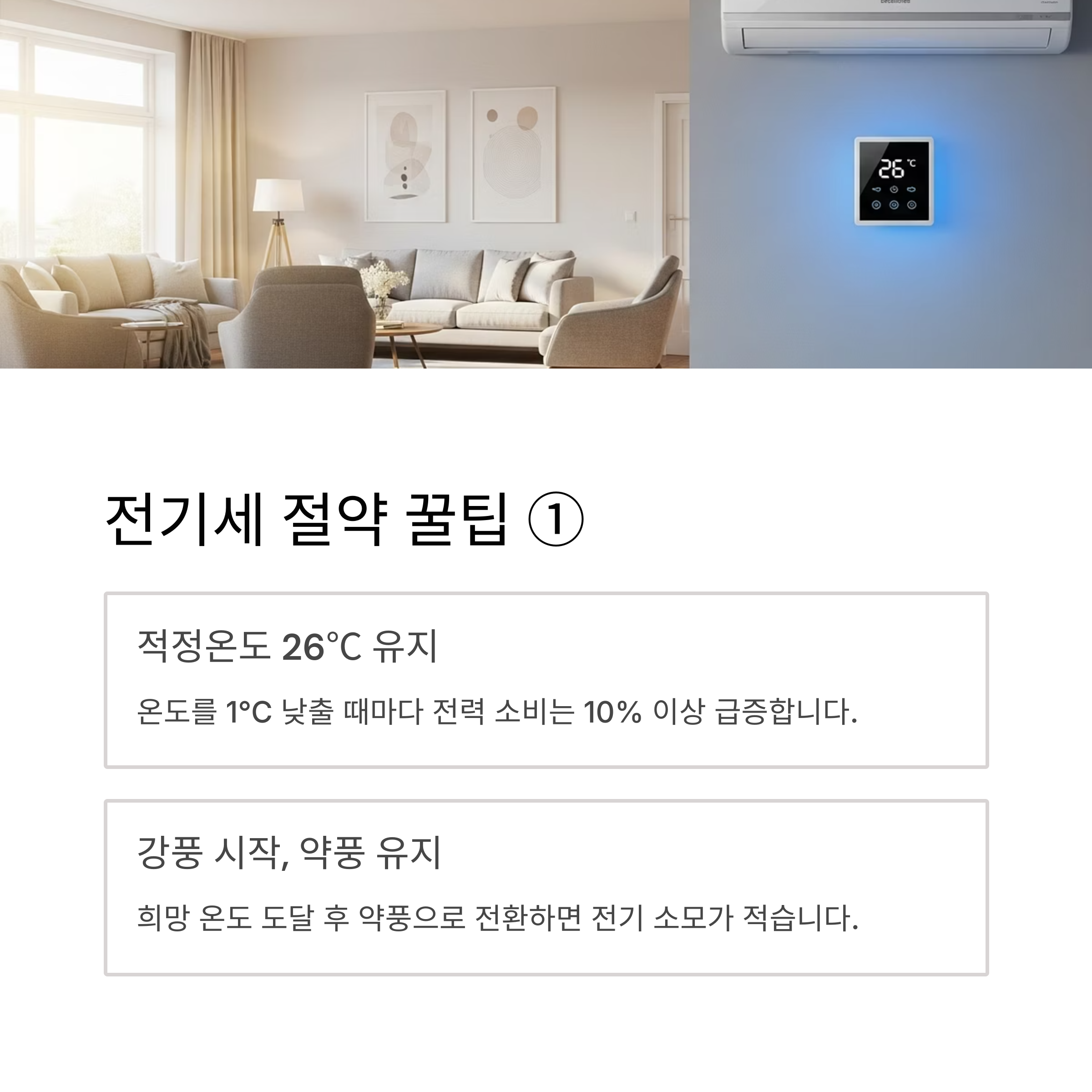 - 적정온도 26℃ 유지하기: 가장 기본이자 핵심입니다. 희망 온도를 1℃ 낮출 때마다 전력 소비는 10% 이상 급증합니다. 26℃로 설정하고 아래의 다른 방법들을 병행하는 것이 가장 효율적입니다.