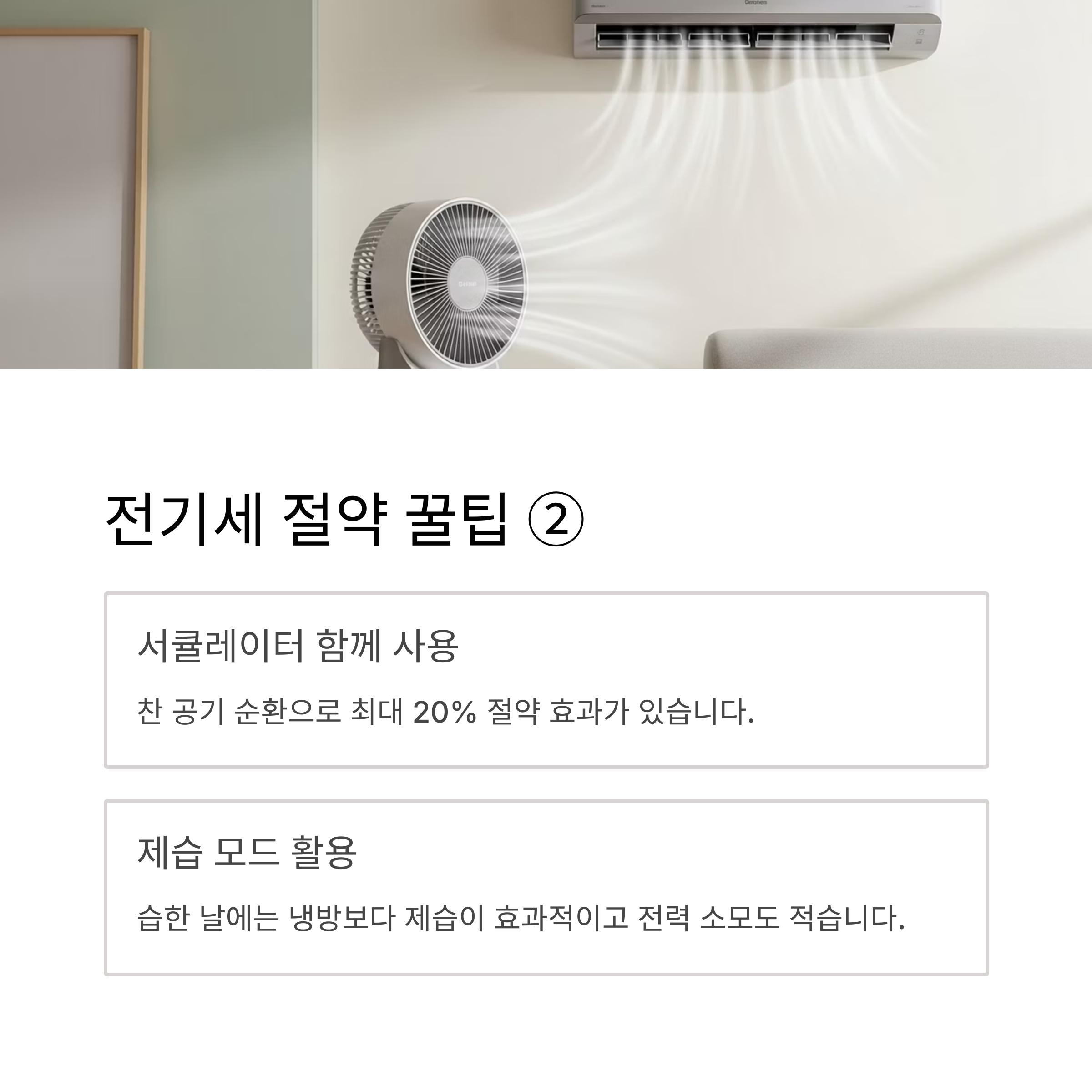 - 서큘레이터·선풍기와 함께 사용: 에어컨을 등지고 서큘레이터나 선풍기를 함께 틀면, 찬 공기가 집안 전체로 빠르게 순환되어 훨씬 빨리 시원함을 느낄 수 있습니다. 에어컨 단독 사용 대비 최대 20%의 절약 효과가 있습니다.