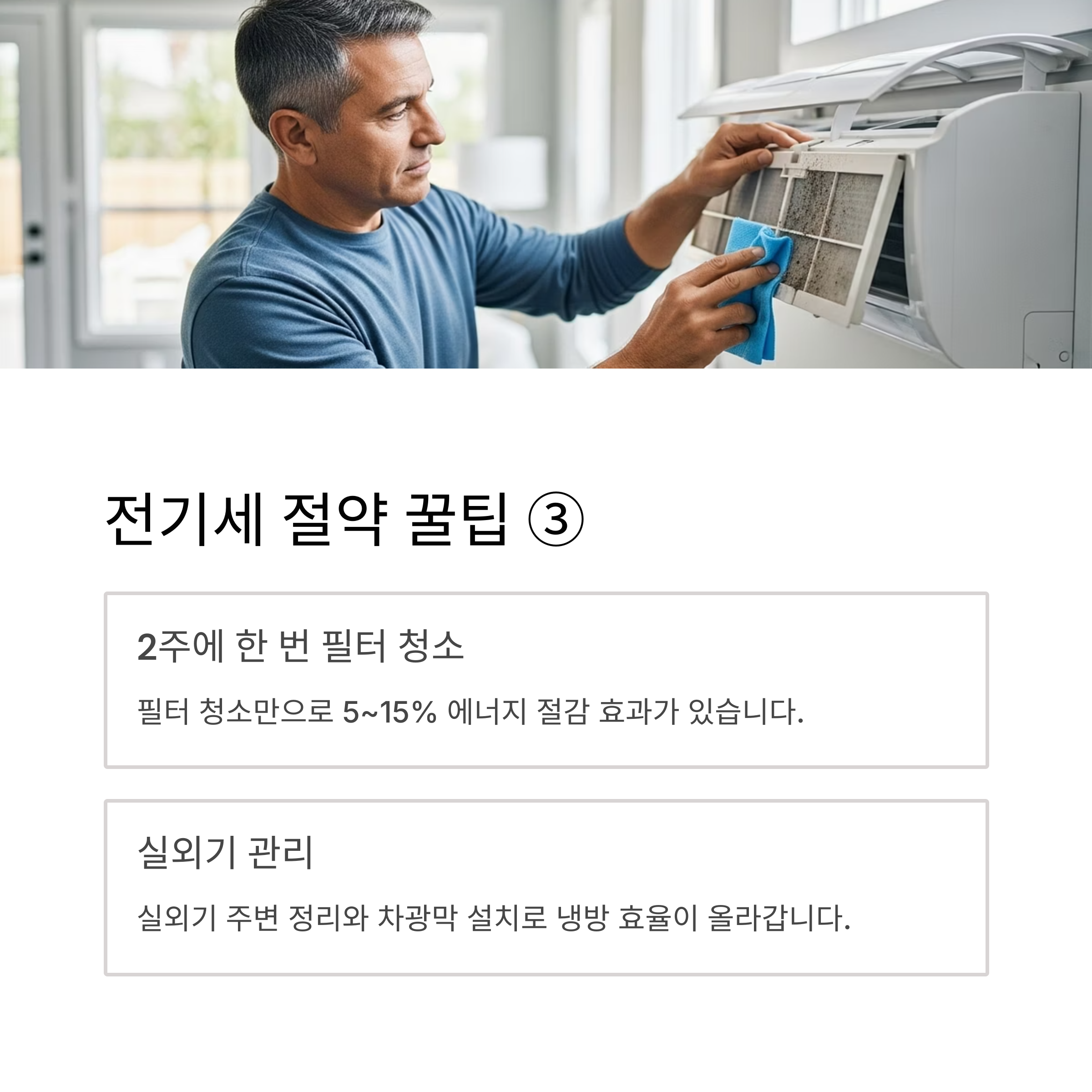 - 2주에 한 번 필터 청소: 필터에 먼지가 쌓이면 냉방 효율이 떨어져 불필요한 전력을 낭비하게 됩니다. 필터 청소만으로도 5~15%의 에너지 절감 효과를 볼 수 있습니다.
