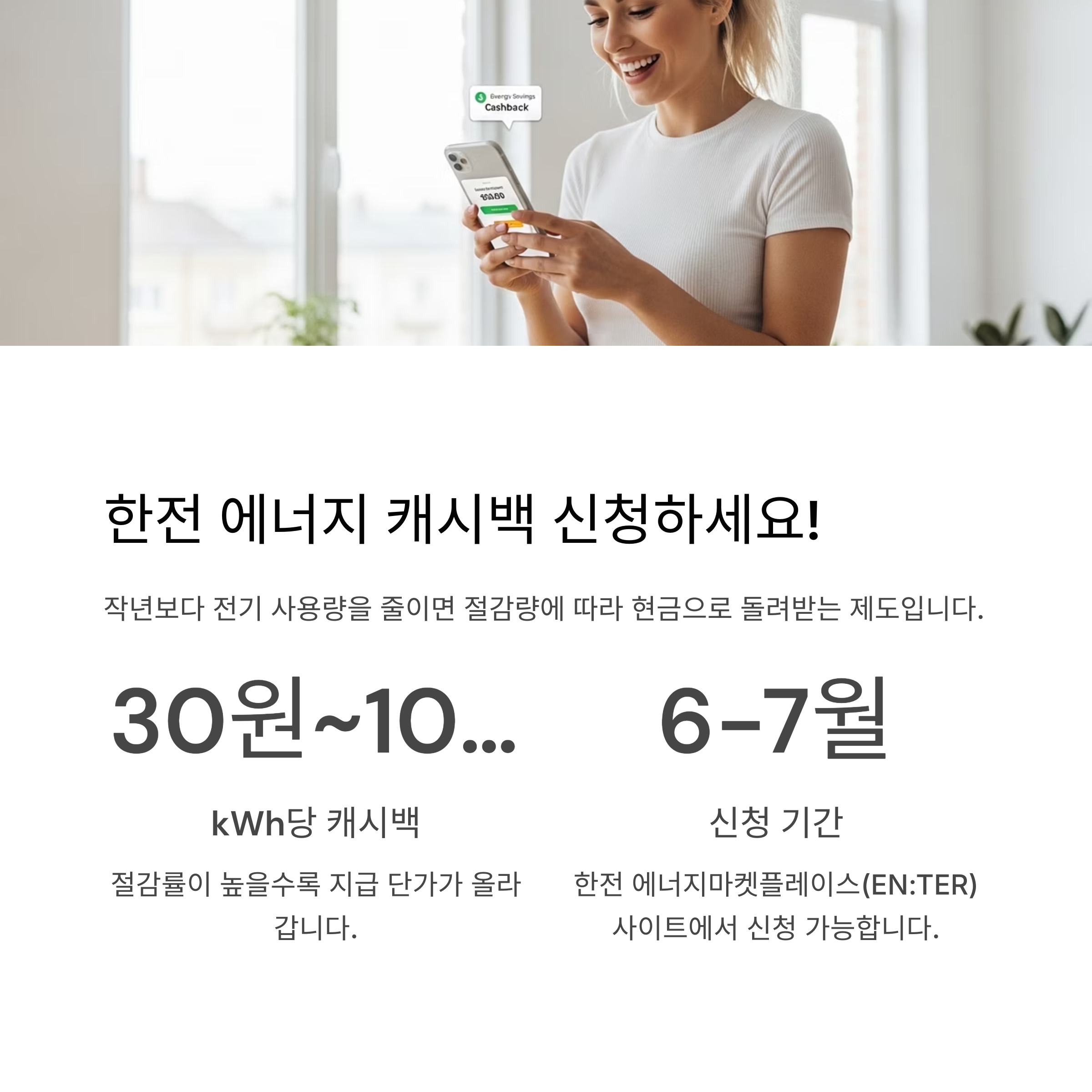 '한전 에너지 캐시백'은 작년 같은 기간보다 전기 사용량을 줄인 가정에 절감량에 따라 현금으로 돌려주는 아주 유용한 제도입니다. 신청만 해두면 자동으로 참여되니, 안 할 이유가 없습니다.