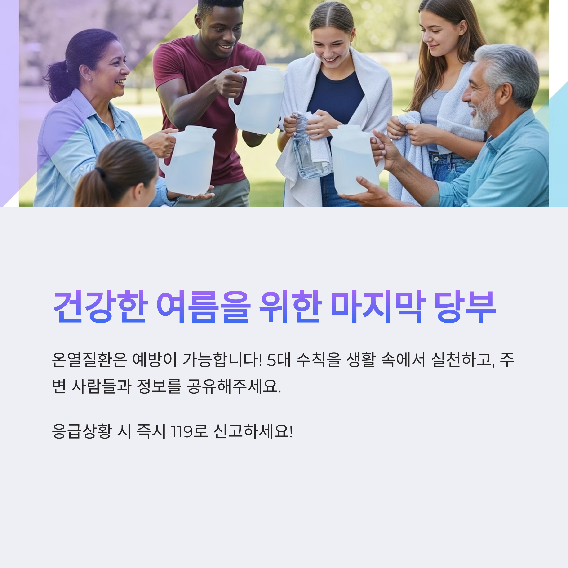 온열질환은 예방할 수 있는 질병입니다. 오늘 알려드린 5대 수칙을 생활 속에서 실천하시고, 가족과 주변 사람들과도 정보를 공유해주세요. 모두가 건강하고 안전한 여름을 보낼 수 있도록 함께 노력합시다!