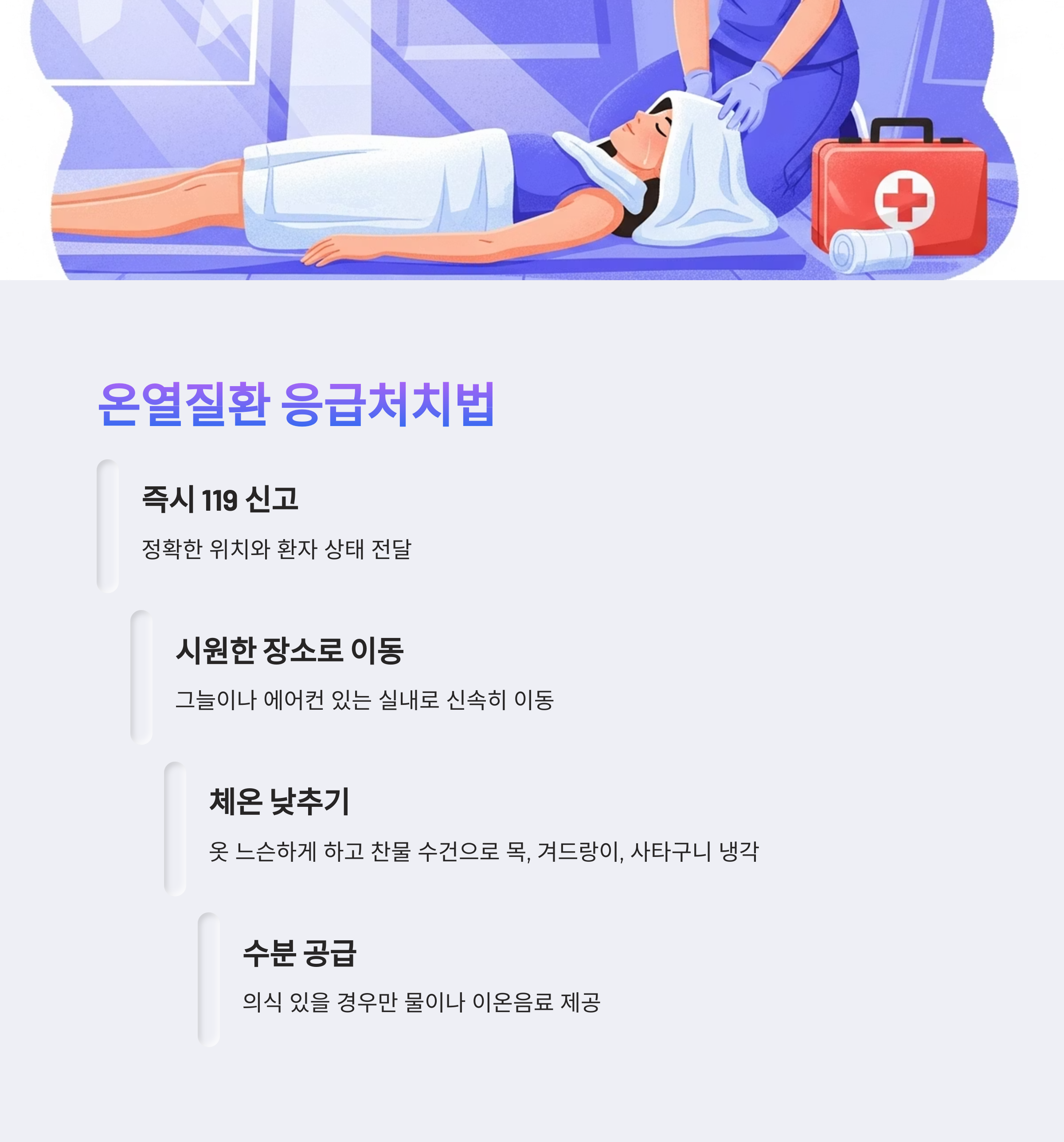 온열질환 응급상황에서는 신속하고 정확한 대처가 생명을 좌우합니다. 상황별 응급처치법과 119 신고 요령을 정확히 숙지하여 골든타임을 놓치지 않도록 해야 합니다.
