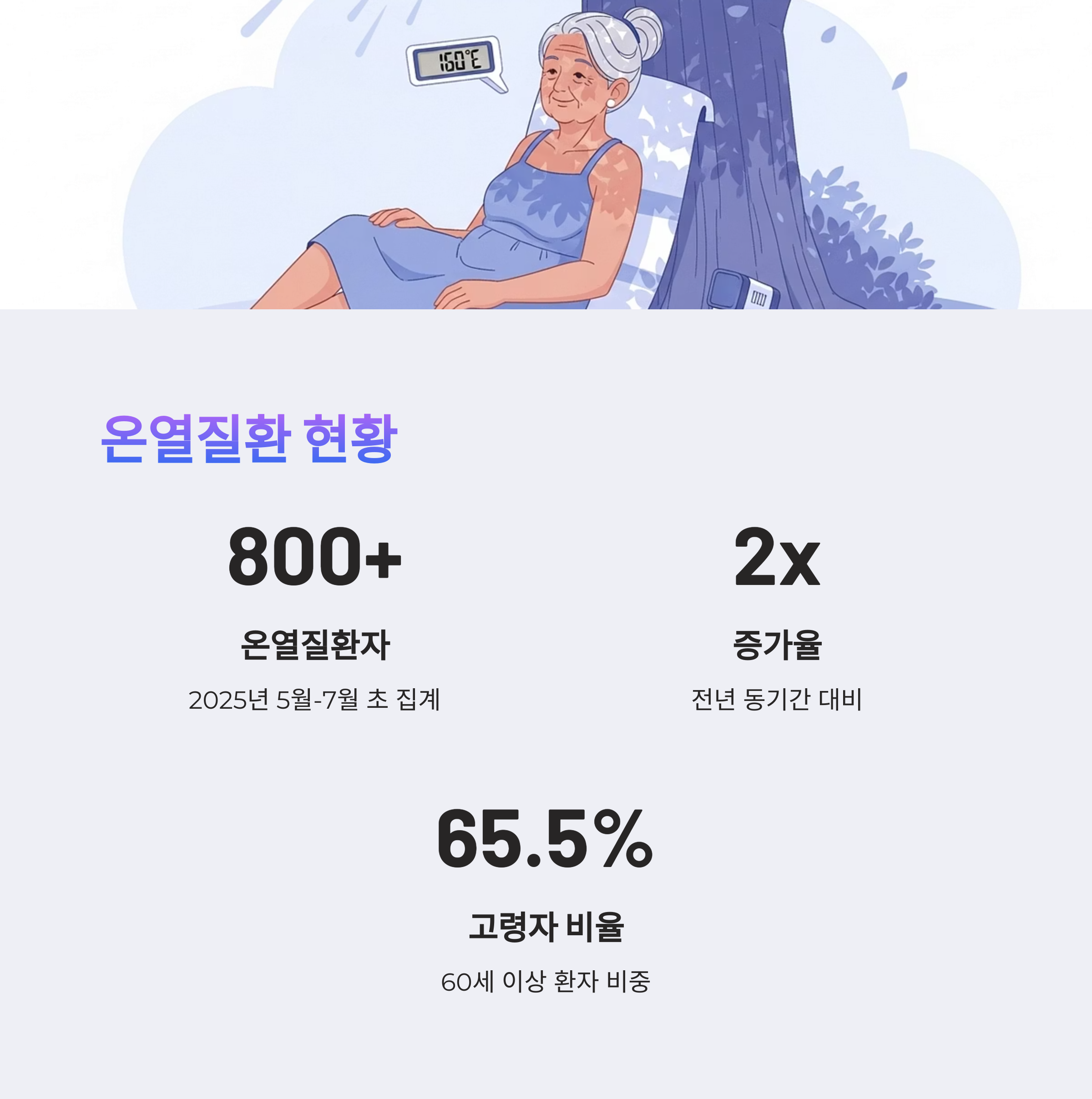 체온 조절 능력이 저하되어 온열질환에 가장 취약한 그룹입니다. 전체 온열질환자의 65.5%를 차지합니다.