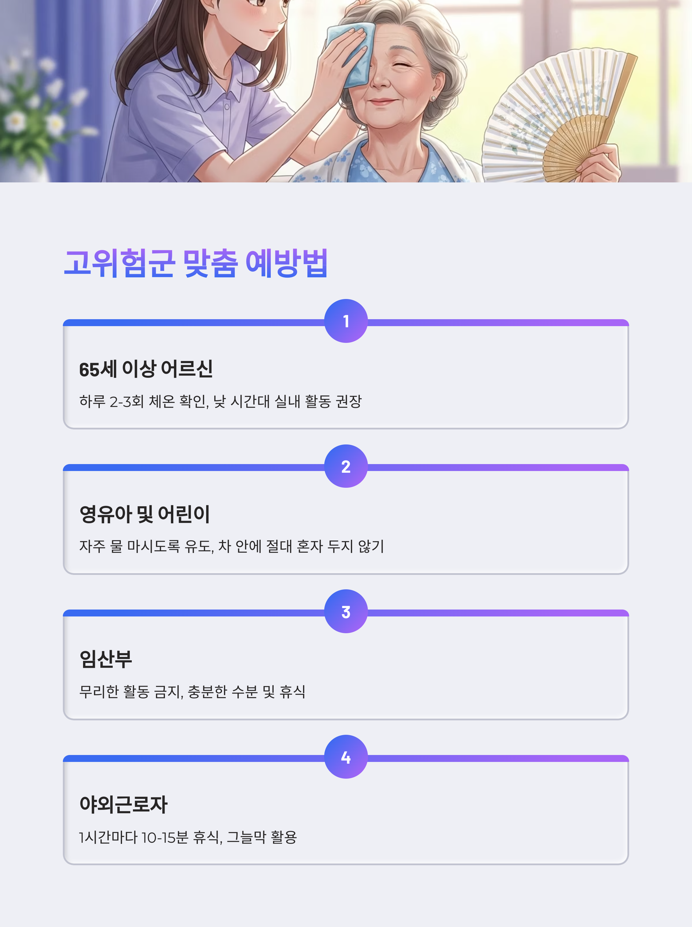 온열질환은 누구에게나 발생할 수 있지만, 특히 체온 조절 능력이 떨어지는 고위험군에서는 더욱 주의가 필요합니다. 각 그룹별 특성에 맞는 예방법을 알아보겠습니다.