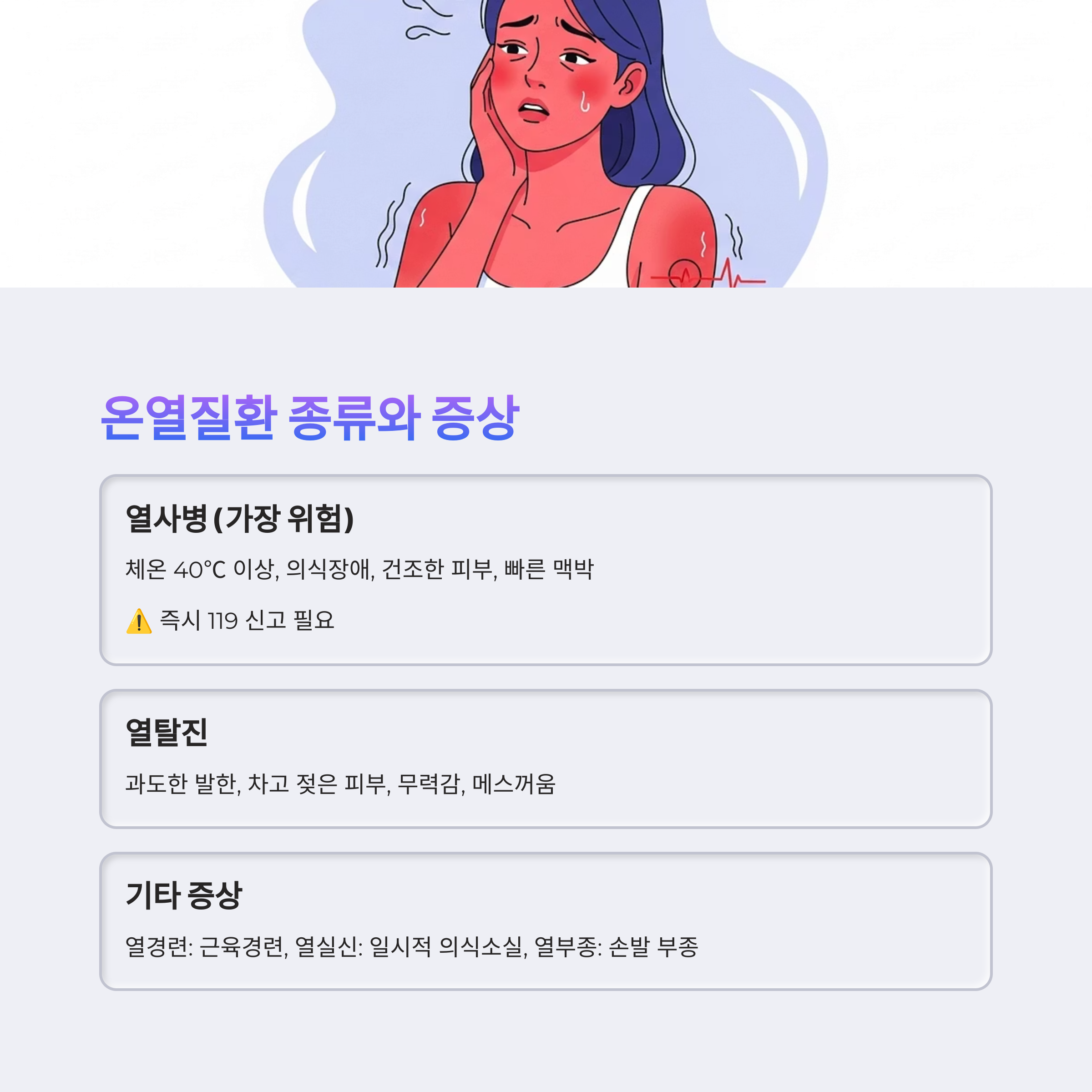 온열질환은 열에 장시간 노출될 경우 발생하는 질환으로, 두통, 어지러움, 근육경련, 피로감, 의식저하 등의 증상이 나타납니다. 각 질환별로 증상과 대처법이 다르므로, 정확한 구분과 이해가 필요합니다.