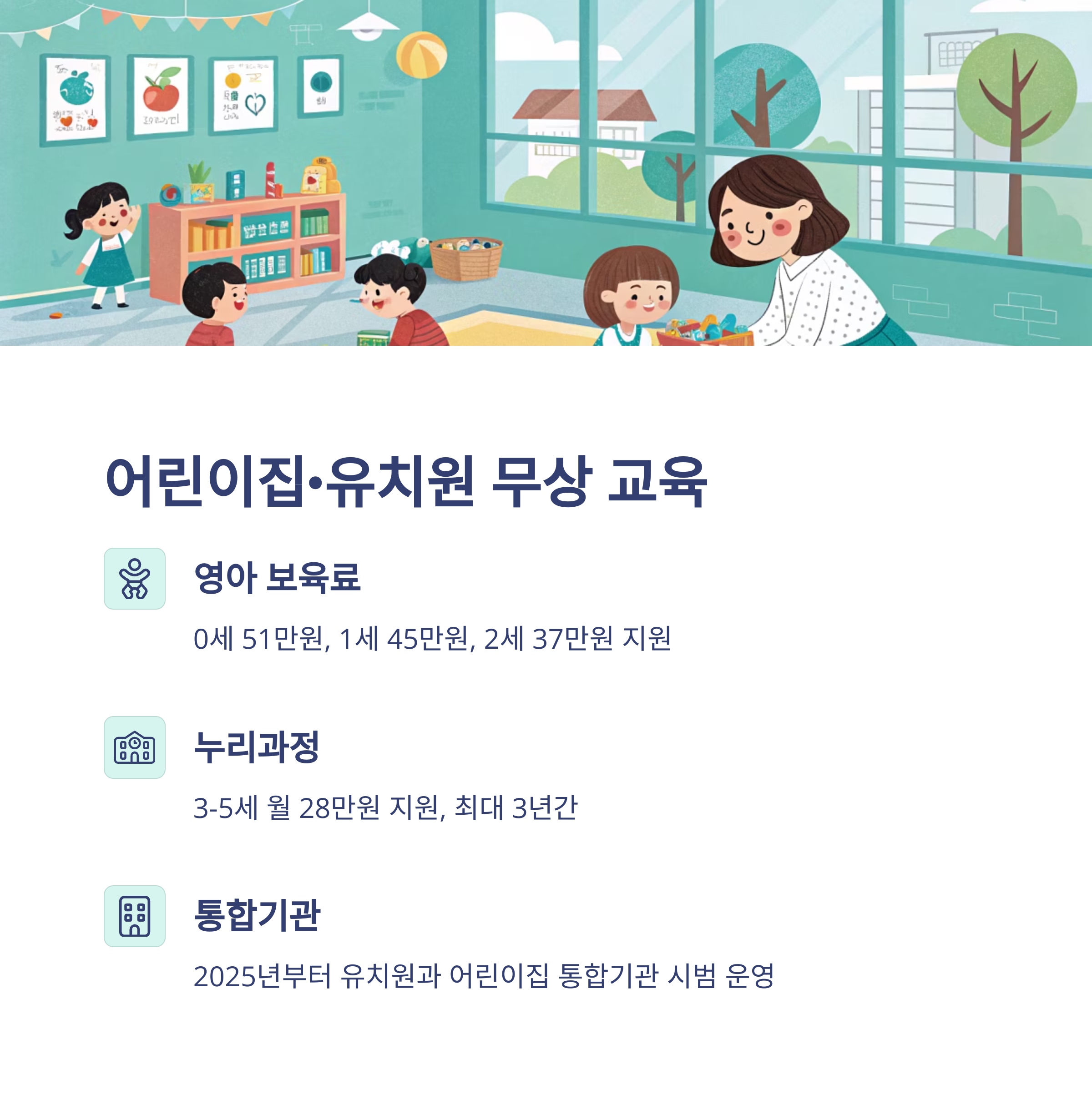 만 3~5세 아동은 어린이집이나 유치원에서 누리과정을 무료로 받을 수 있습니다. 2025년에도 계속해서 전면 무상교육이 시행되고 있어요.