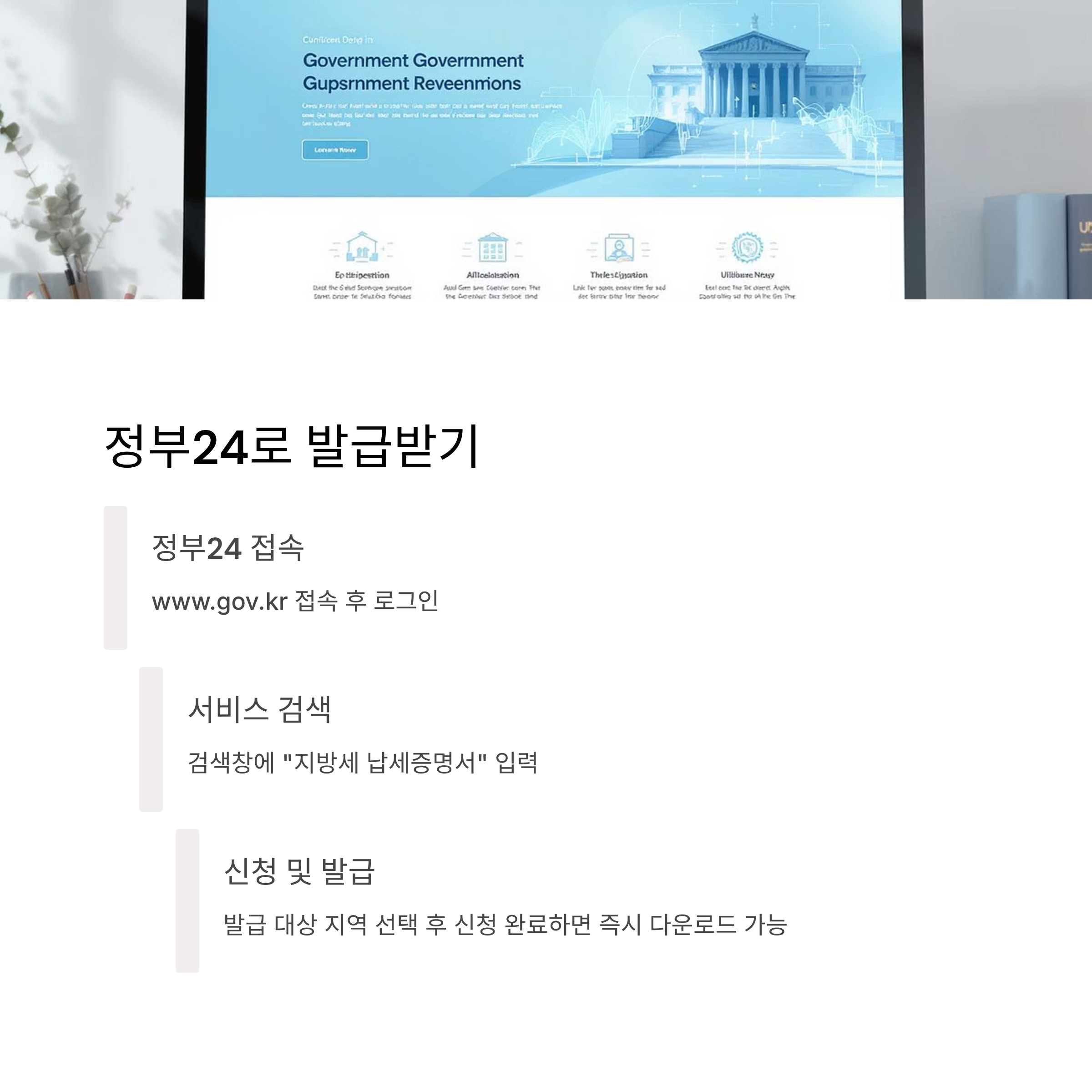 정부24는 대한민국 정부의 통합 온라인 민원서비스로, 다양한 정부 서비스를 한 곳에서 이용할 수 있습니다. 지방세 납세증명서도 간편하게 발급받을 수 있습니다.