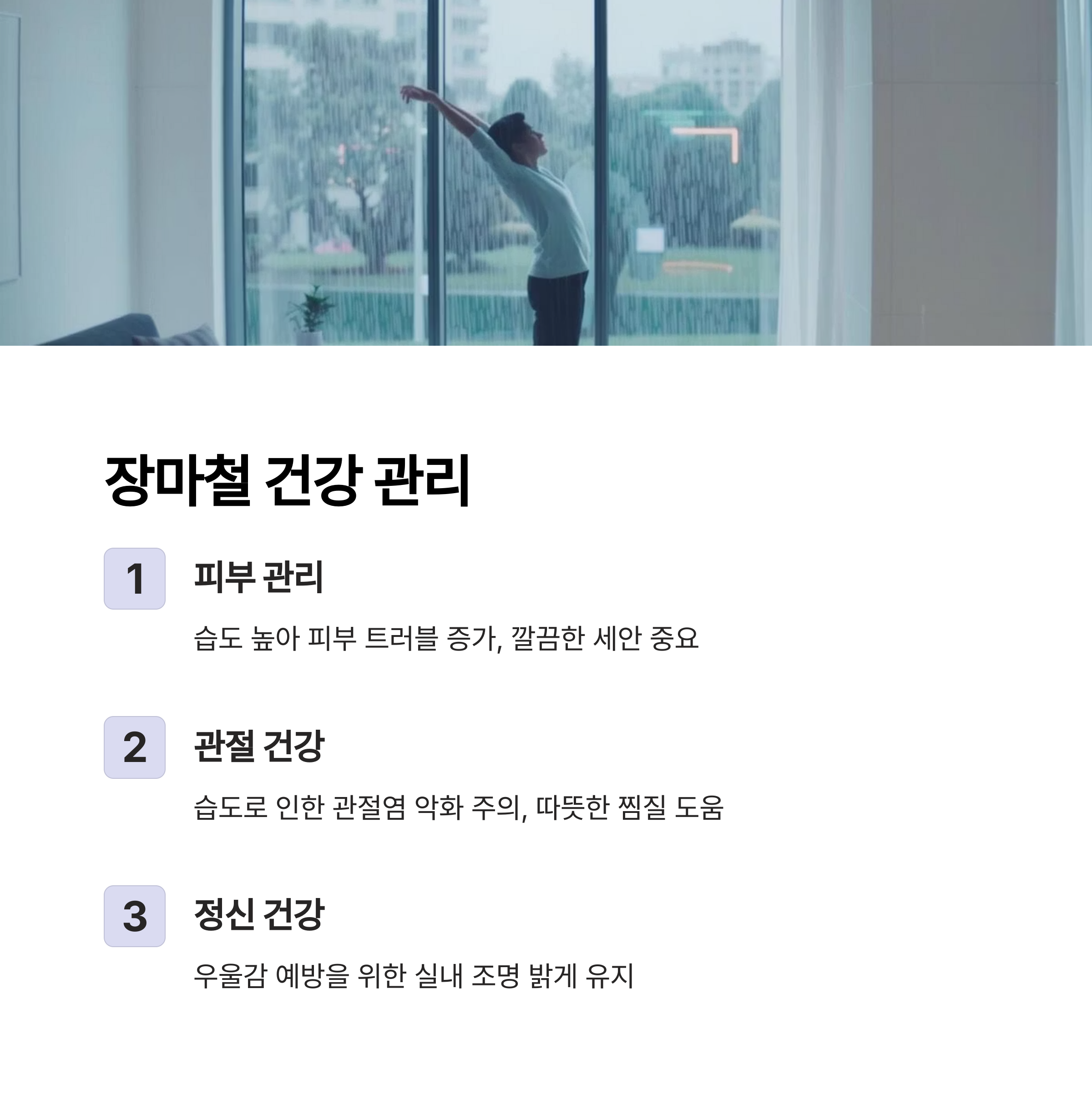 - 피부 관리: 습도가 높아 피부 트러블 증가, 깔끔한 세안 중요